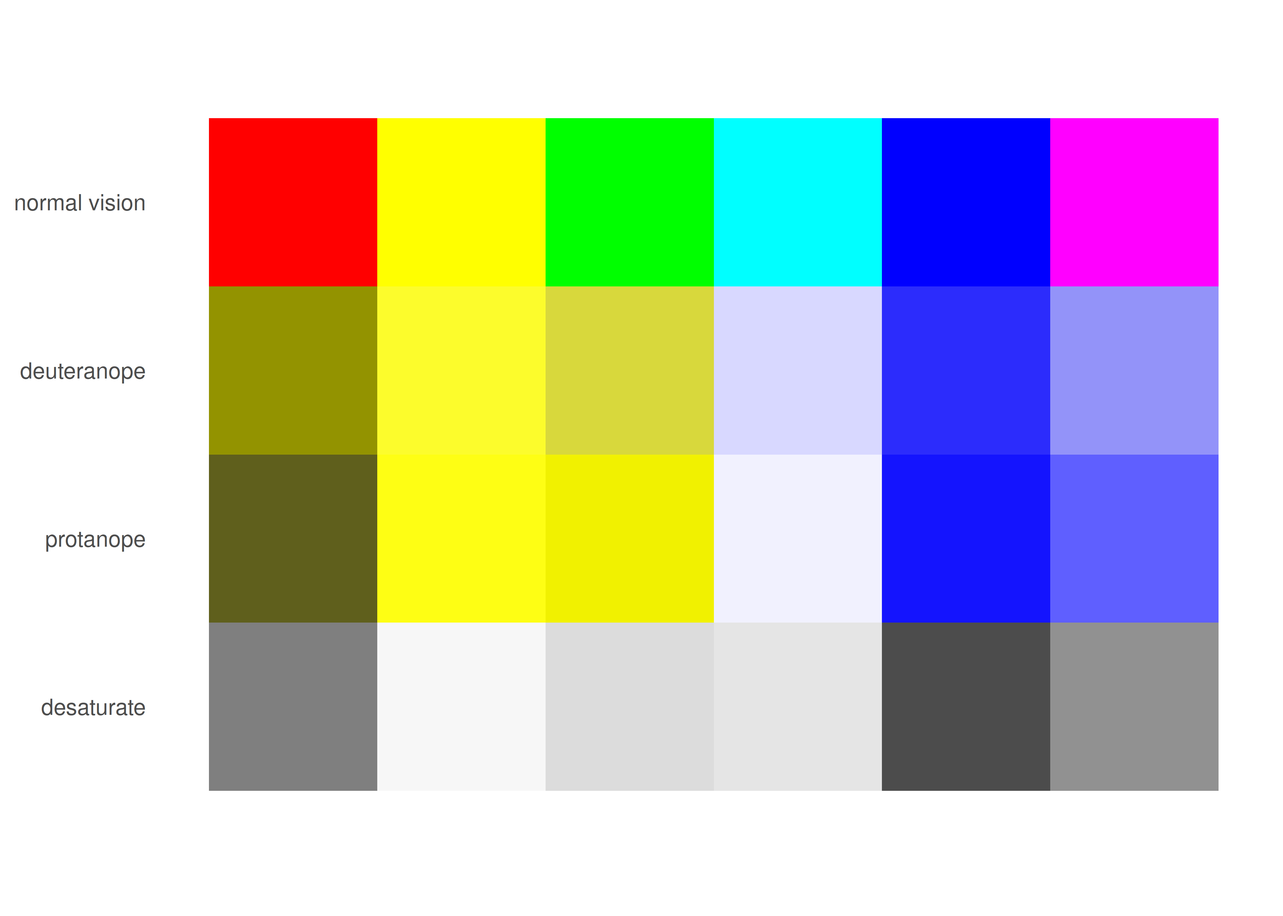 Una complicación adicional es que una minoría considerable de personas no posee el complemento habitual de receptores de color y, por tanto, puede distinguir menos colores que otros. Debido a esto, es importante considerar cómo se verá una paleta de colores para las personas con formas comunes de daltonismo. Una heurística simple es evitar los contrastes rojo-verde y verificar sus gráficos con sistemas que simulen el daltonismo. Además de las muchas herramientas en línea que pueden ayudar con esto (por ejemplo, https://www.vischeck.com/), existen varios paquetes de R que proporcionan herramientas que pueden resultarle útiles. El paquete dicromático (dichroma?) proporciona herramientas para simular el daltonismo y un conjunto de combinaciones de colores que se sabe que funcionan bien para las personas daltónicas. Otra herramienta útil es el paquete colorBlindness (Ou 2021) que proporciona una función displayAllColors() que le ayuda a aproximar la apariencia de un conjunto determinado de colores bajo diferentes formas de daltonismo. A modo de ilustración, revela rápidamente que los colores proporcionados por la paleta rainbow() no son apropiados si estás tratando de crear gráficos que sean legibles para personas daltónicas, ni se reproducen bien en escala de grises: