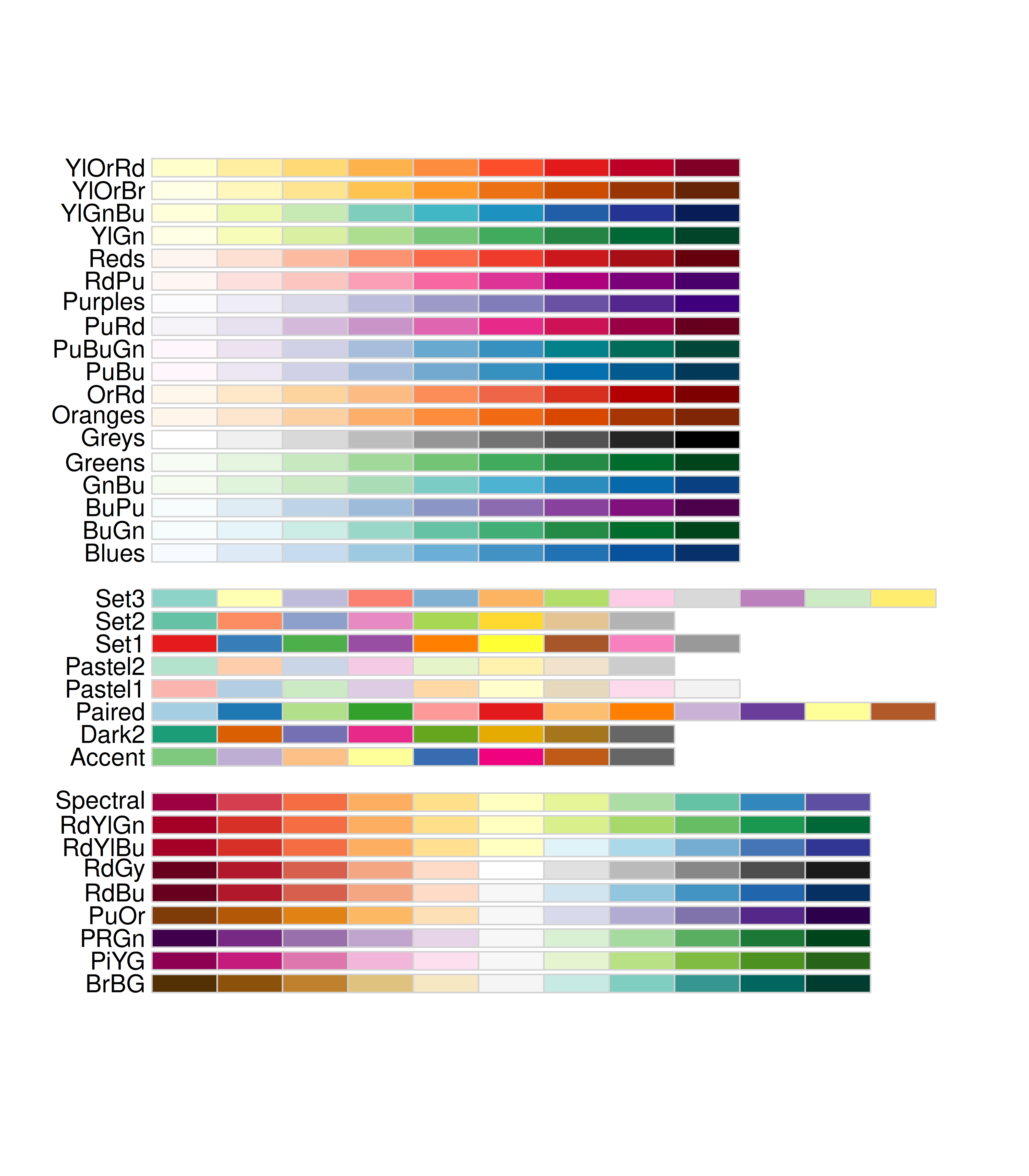 Otra alternativa la proporciona el paquete Paletteer, discutido anteriormente en relación con las escalas de color continuas en Sección 11.2.1. Al proporcionar una interfaz unificada que abarca una gran cantidad de paquetes, Paletteer permite elegir entre una gran cantidad de paletas de manera consistente: