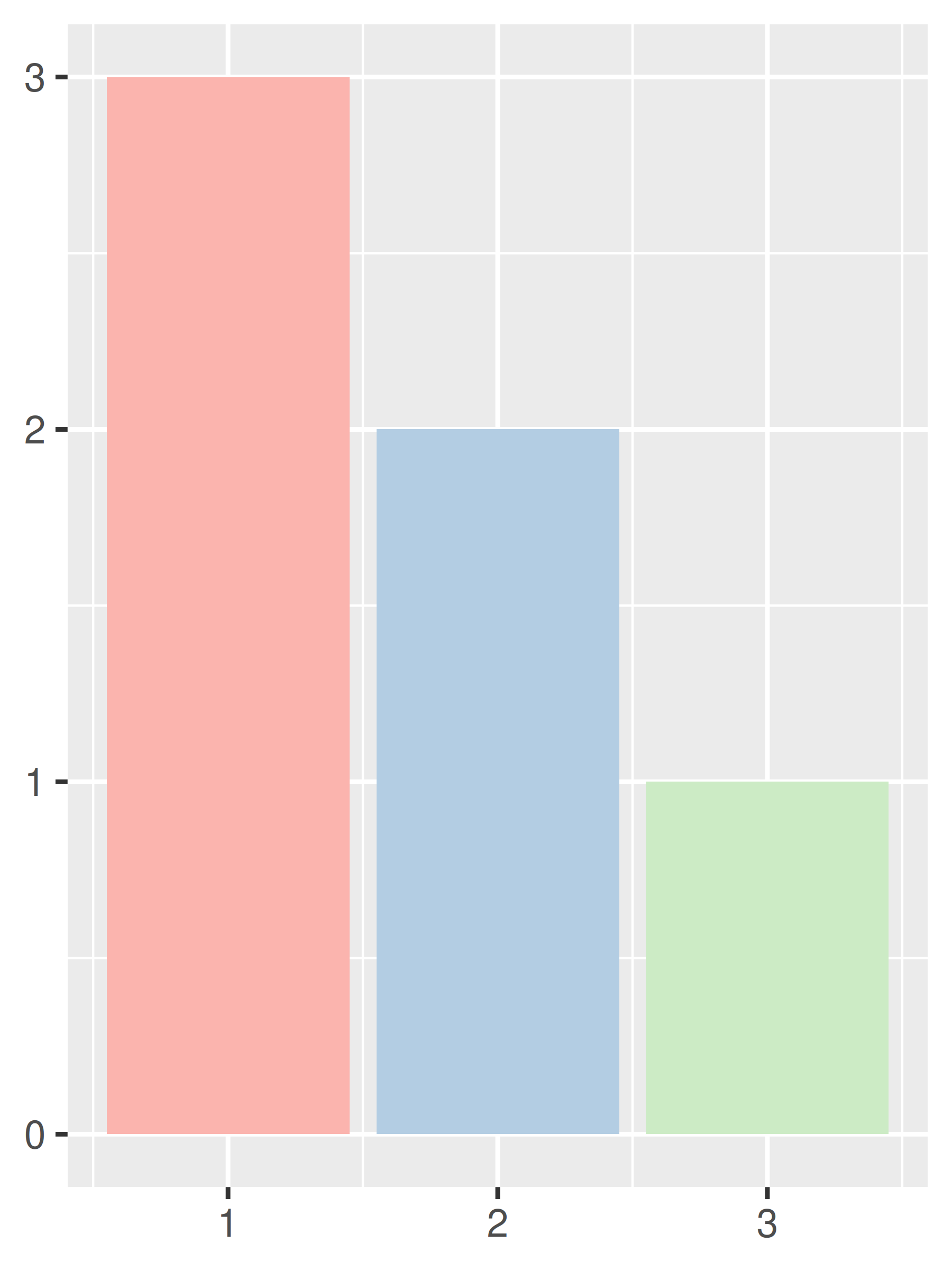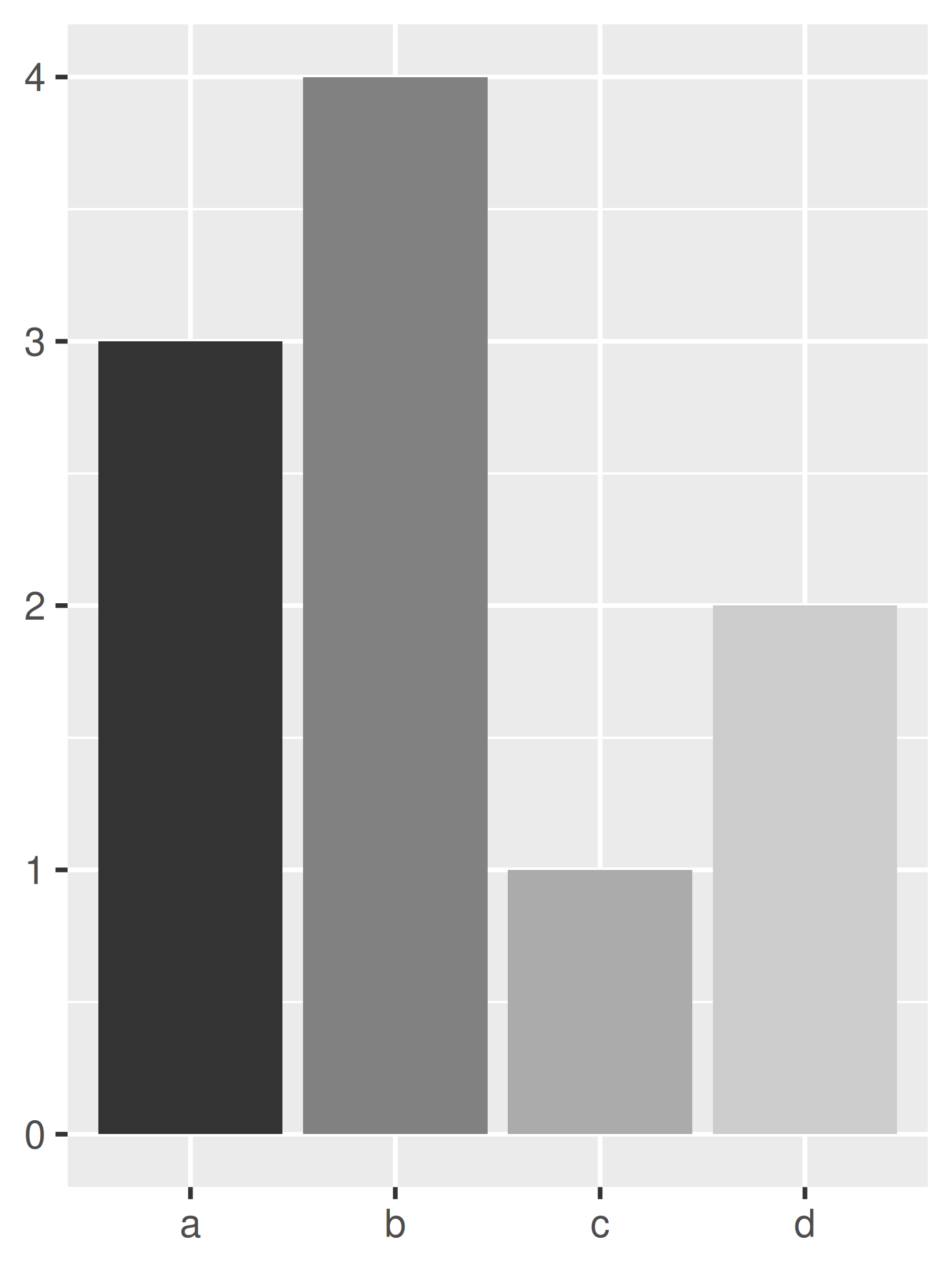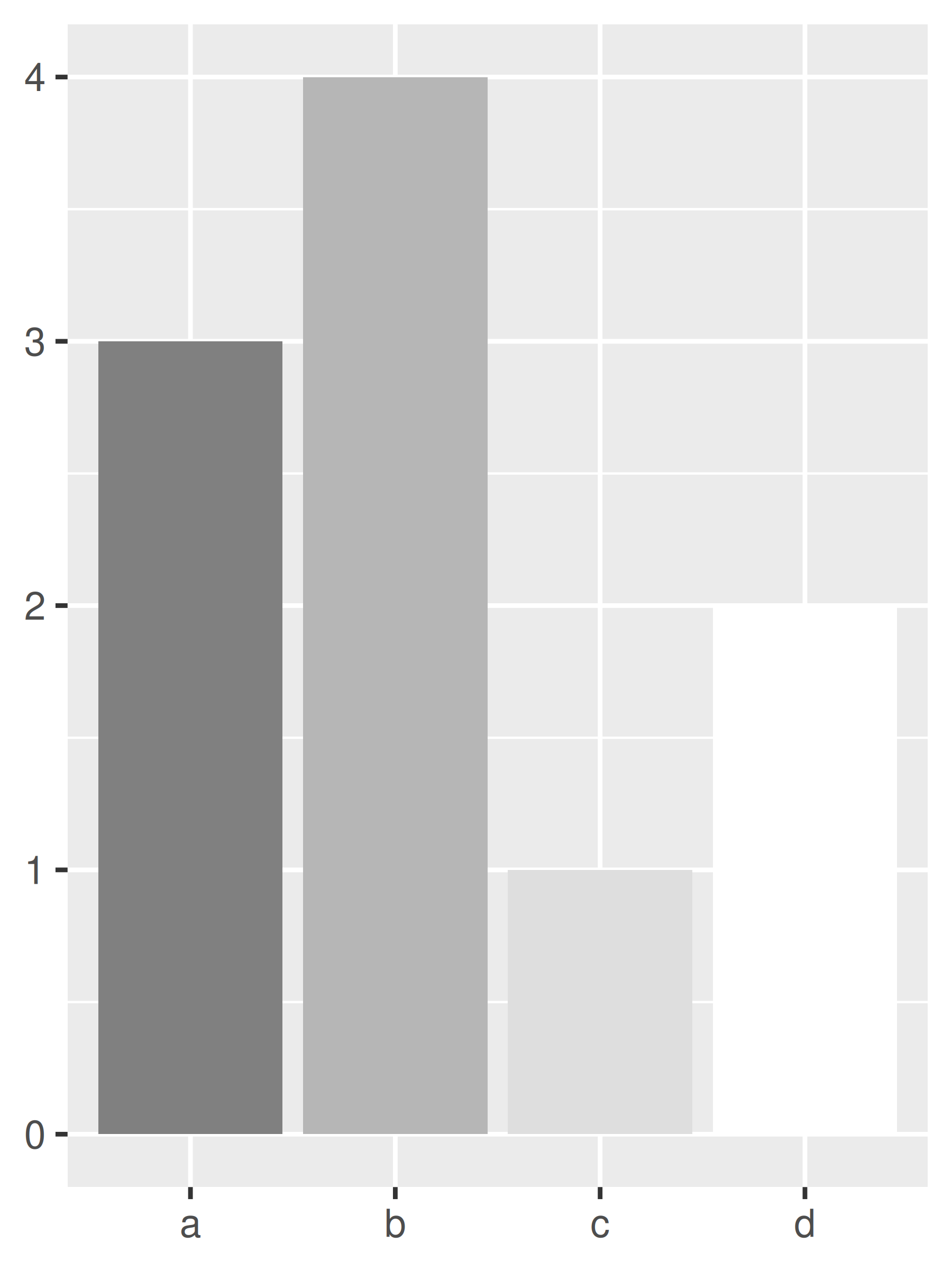 Hay algunos problemas con este esquema predeterminado. Una es que, a diferencia de muchas de las otras paletas analizadas en este capítulo, no son seguras para los daltónicos (lo que se analiza en ?sec-color-blindness). La segunda es que, debido a que todos los colores tienen la misma luminancia y croma, todos aparecen con un tono de gris idéntico cuando se imprimen en blanco y negro. Si desea imprimir una escala de color discreta en blanco y negro, es mejor usar explícitamente scale_fill_grey() que asigna datos discretos a grises, de claro a oscuro: