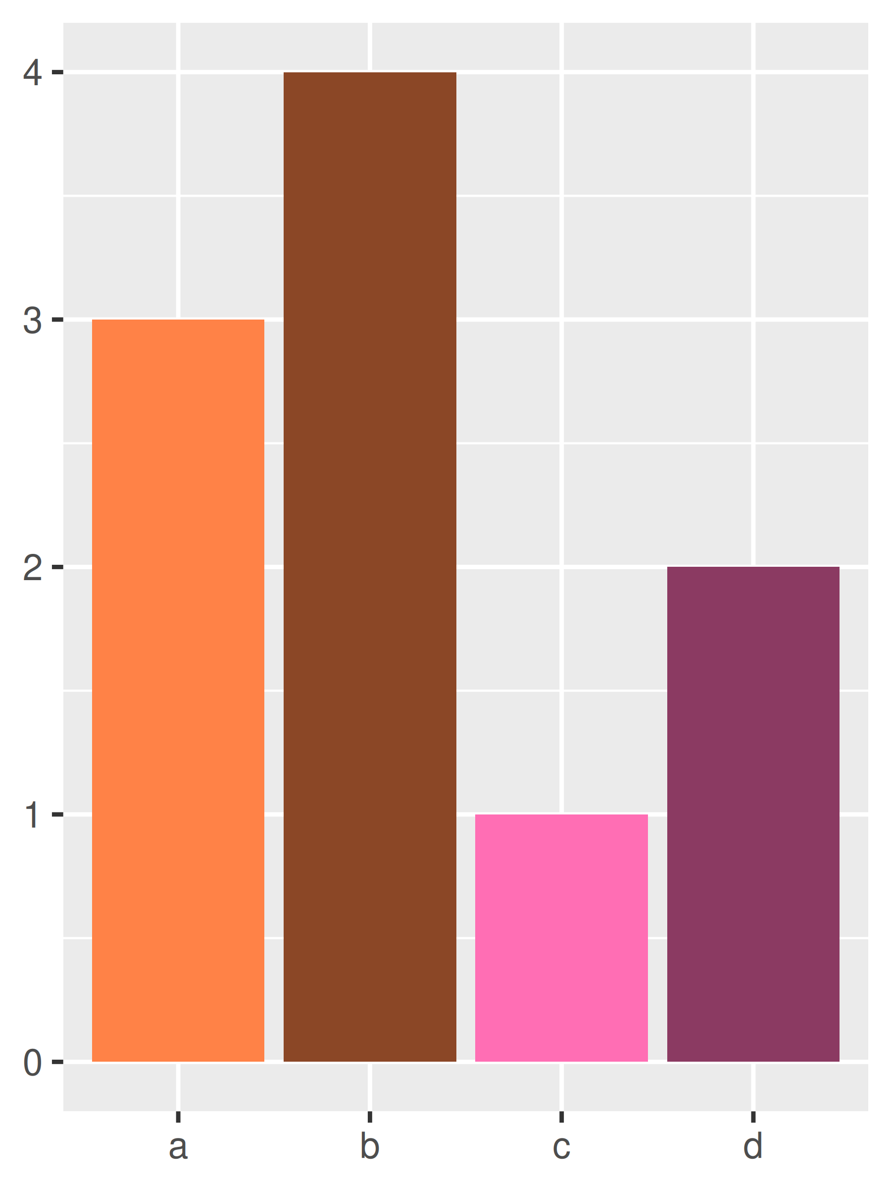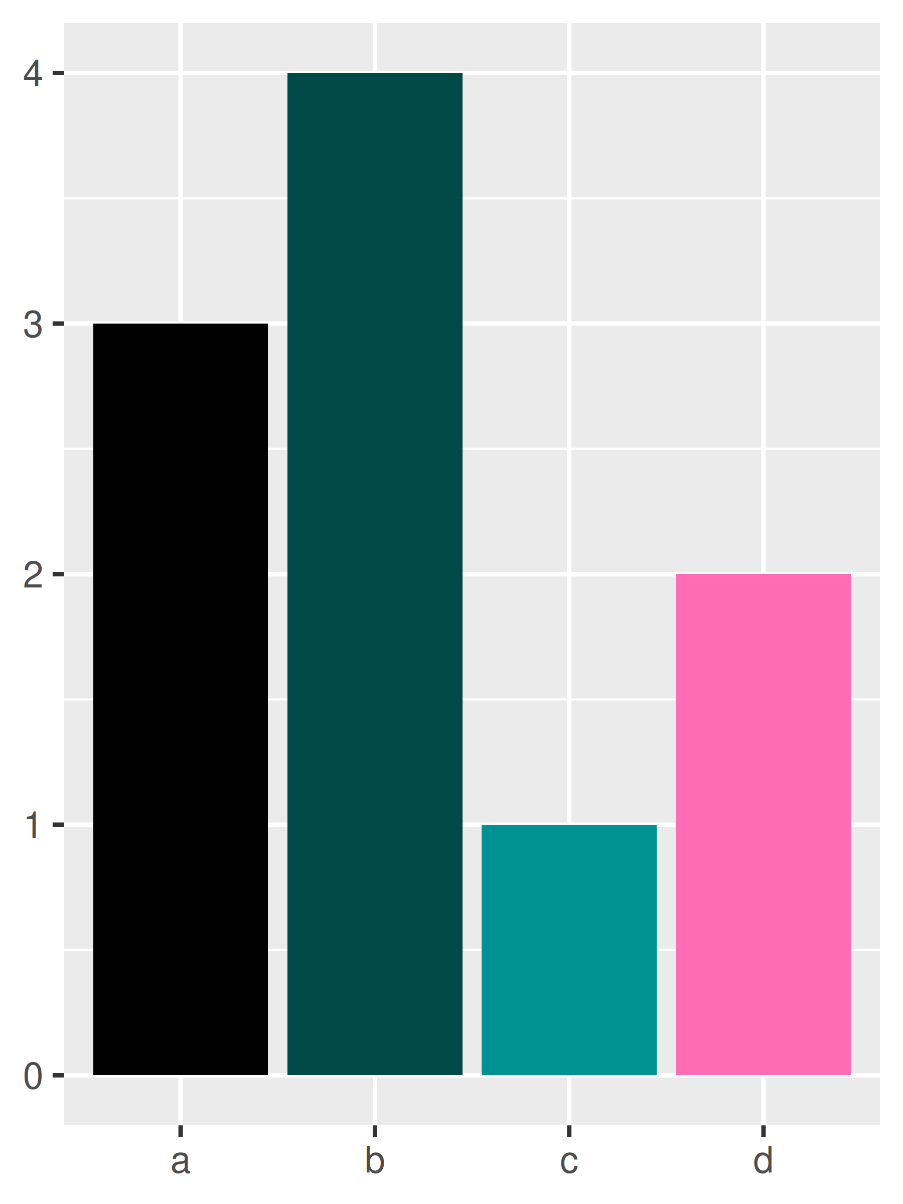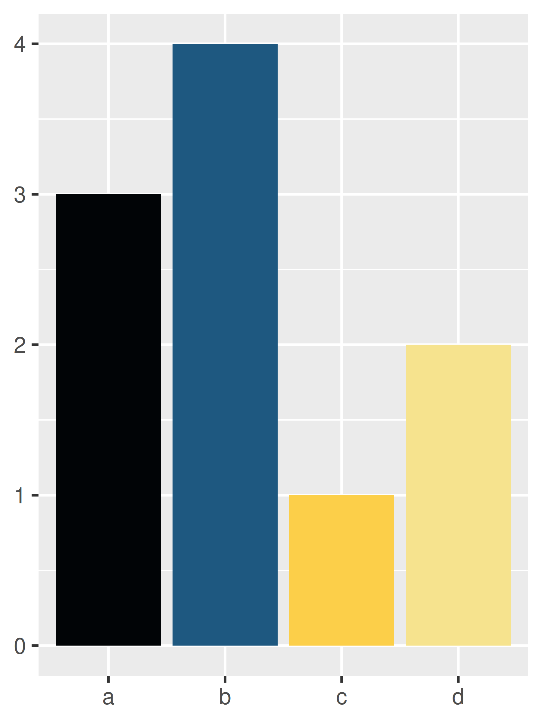 Si ninguna de las paletas preexistentes es adecuada, o si tiene sus propios colores preferidos, puede usar scale_fill_manual() para configurar los colores manualmente. Esto puede resultar útil si desea elegir colores que resalten una estructura de agrupación secundaria o llamen la atención sobre diferentes comparaciones: