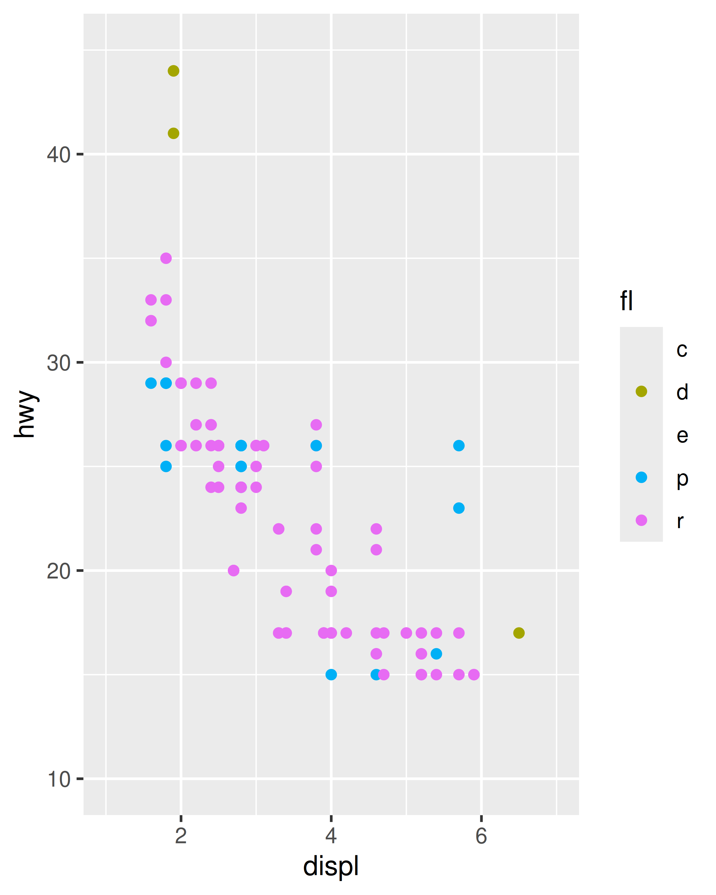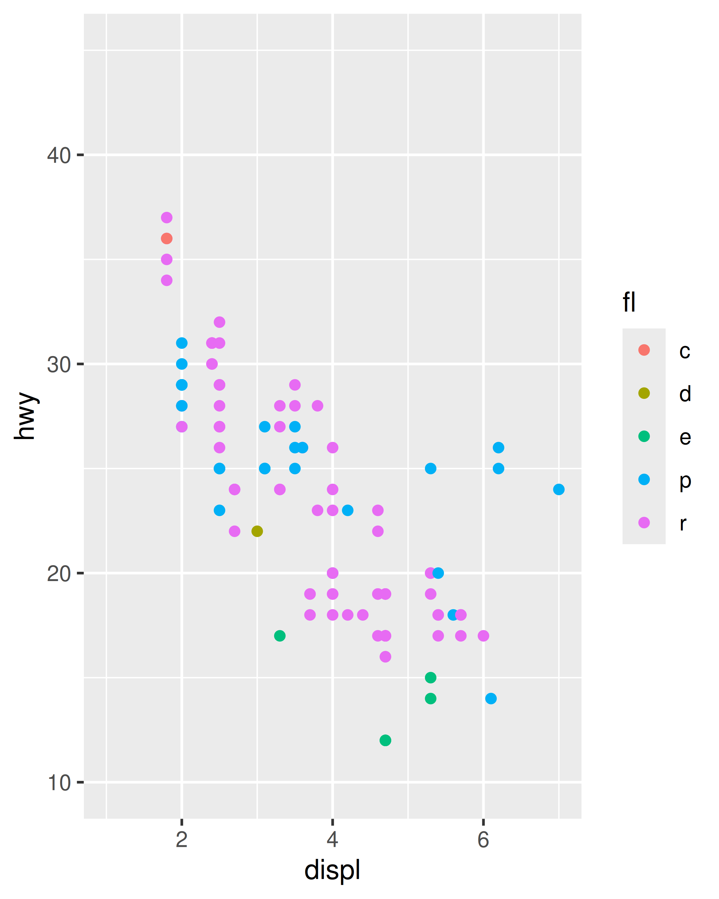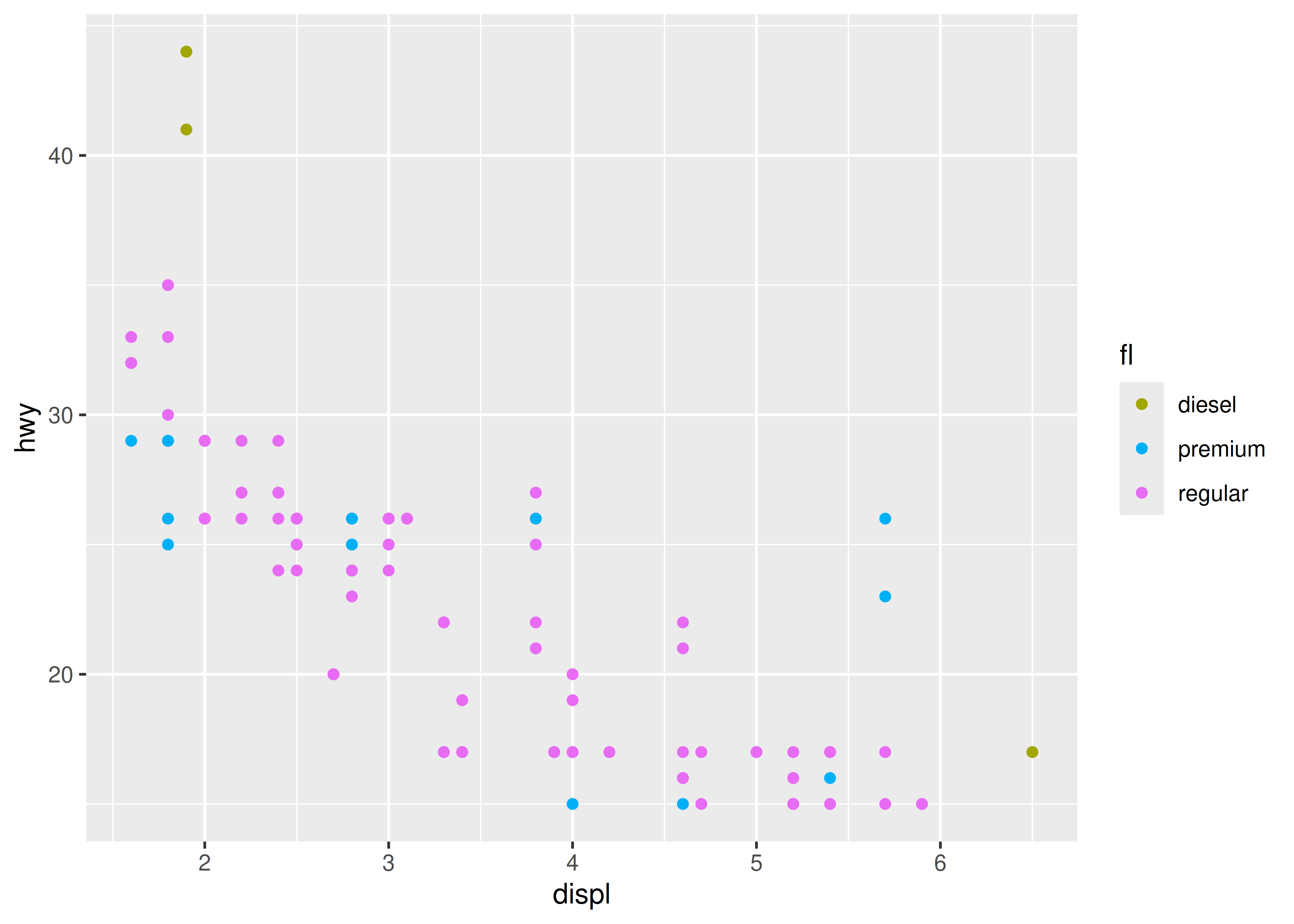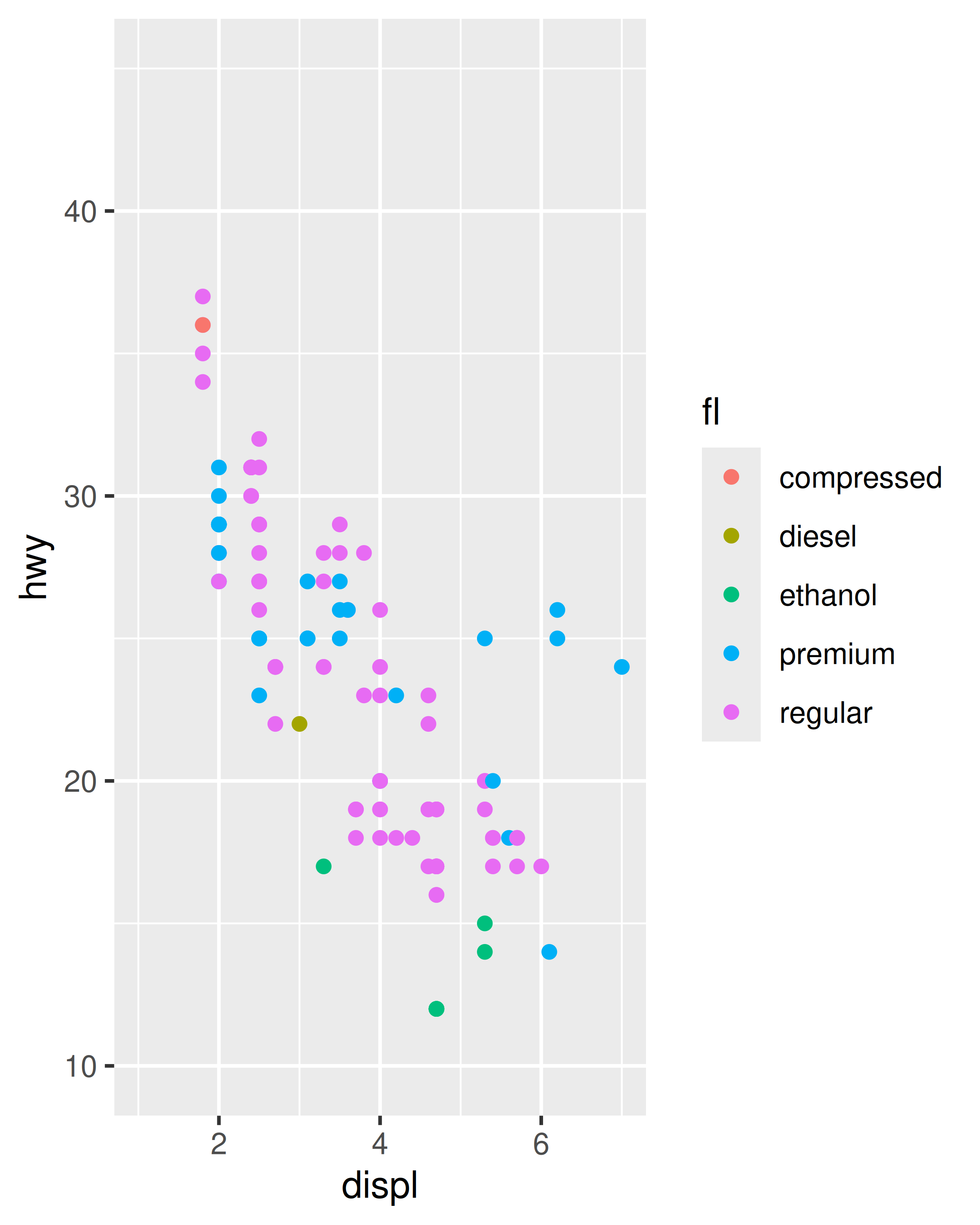 Los límites de escala para escalas de colores discretas se pueden establecer usando el argumento limits para el argumento de escala, o usando la función auxiliar lims(). Esto puede ser importante cuando la misma variable se representa en diferentes gráficos y desea asegurarse de que los colores sean consistentes en todos los gráficos. Para demostrar esto, ampliaremos el ejemplo de Sección 10.1.1. El color representa el tipo de combustible, que puede ser rregular, etanol, ddiesel, premium o cgas natural comprimido.