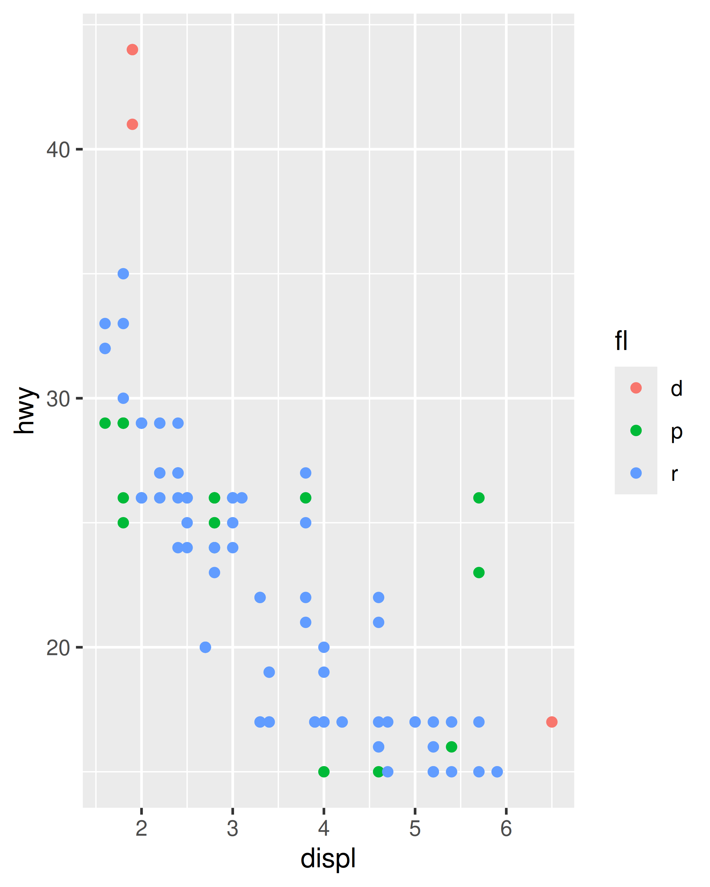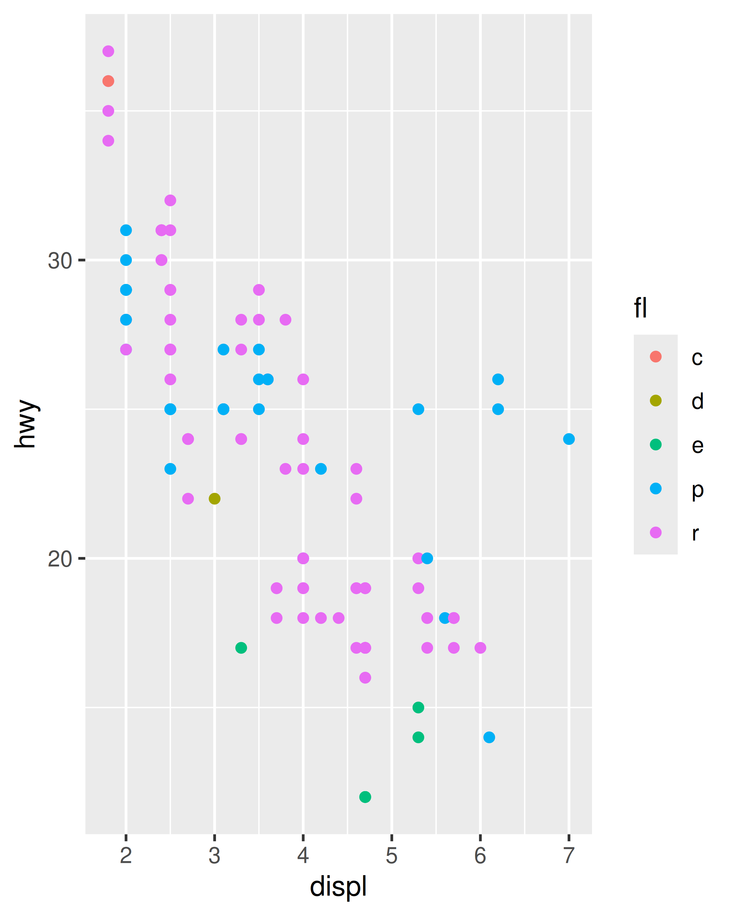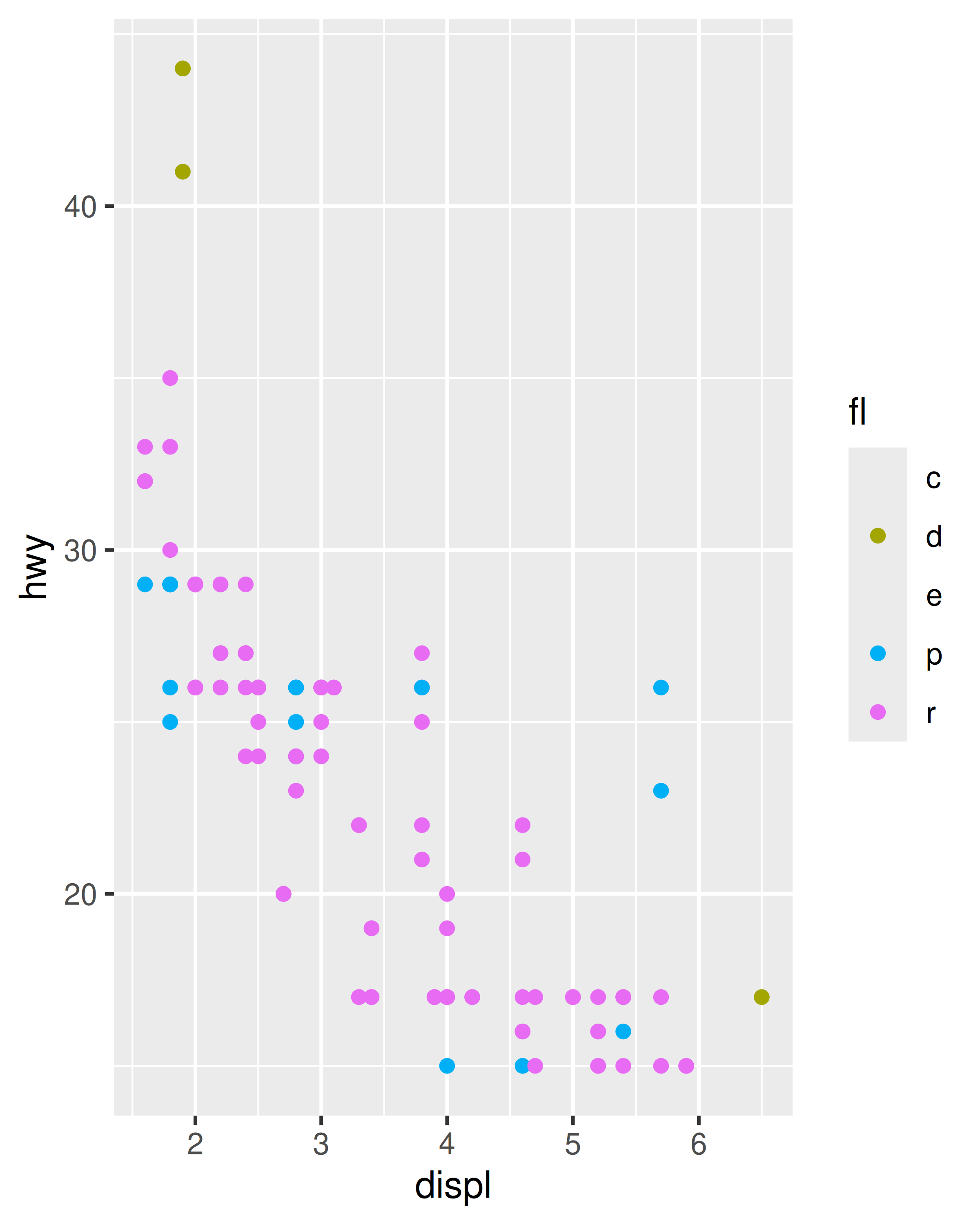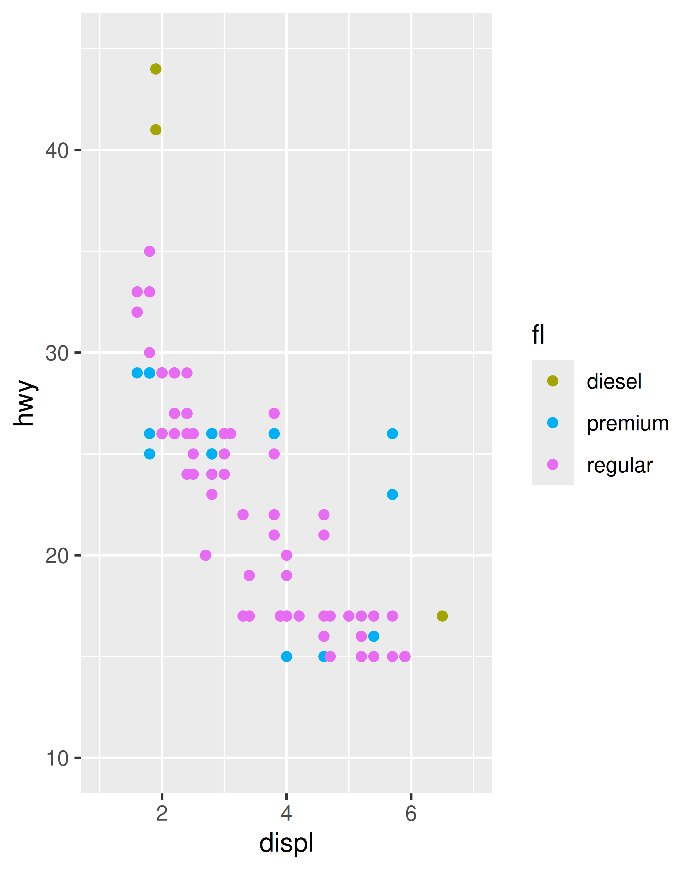 Los límites de escala para escalas de colores discretas se pueden establecer usando el argumento limits para el argumento de escala, o usando la función auxiliar lims(). Esto puede ser importante cuando la misma variable se representa en diferentes gráficos y desea asegurarse de que los colores sean consistentes en todos los gráficos. Para demostrar esto, ampliaremos el ejemplo de Sección 10.1.1. El color representa el tipo de combustible, que puede ser rregular, etanol, ddiesel, premium o cgas natural comprimido.