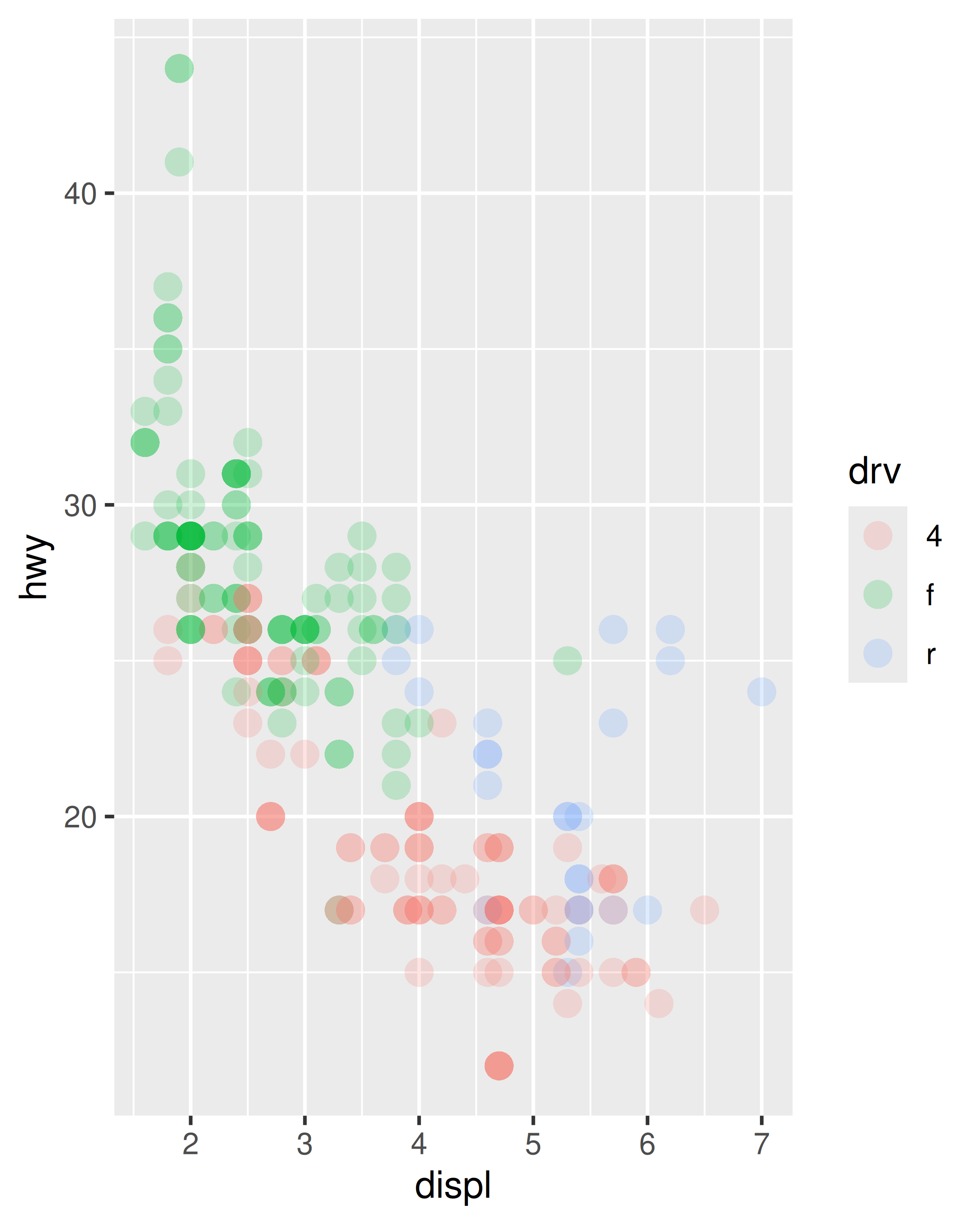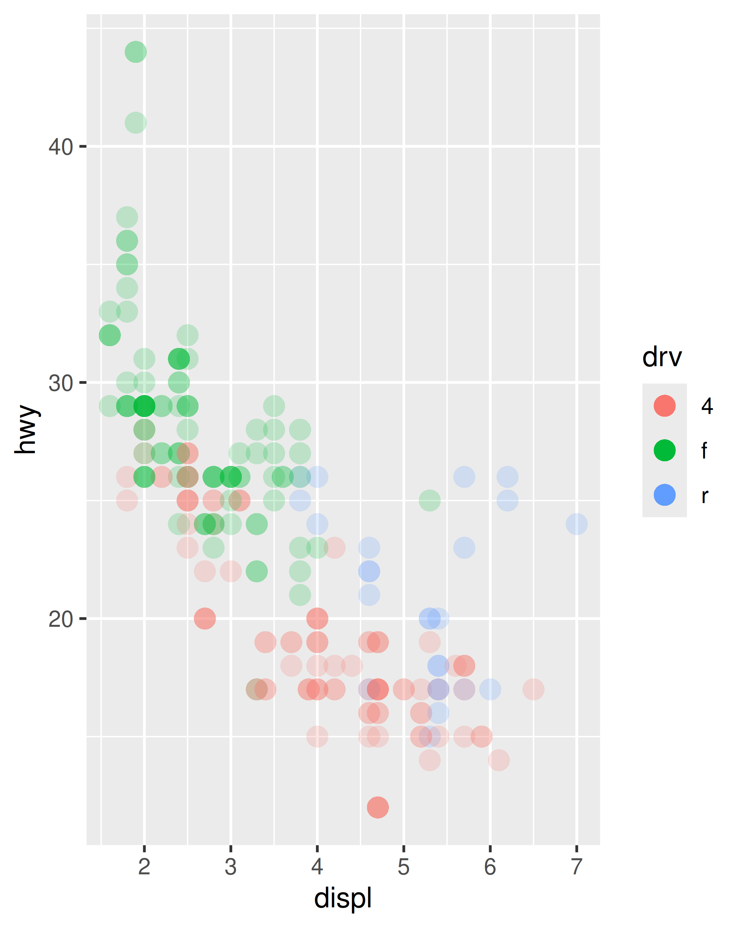 override.aeses útil cuando desea que los elementos de la leyenda se muestren de manera diferente a las geomas del gráfico. Esto suele ser necesario cuando se ha utilizado transparencia o tamaño para tratar un sobretrazado moderado y también se ha utilizado color en el trazado.base <- ggplot(mpg, aes(displ, hwy, colour = drv)) + geom_point(size = 4, alpha = .2, stroke = 0) base + guides(colour = guide_legend()) base + guides(colour = guide_legend(override.aes = list(alpha = 1)))