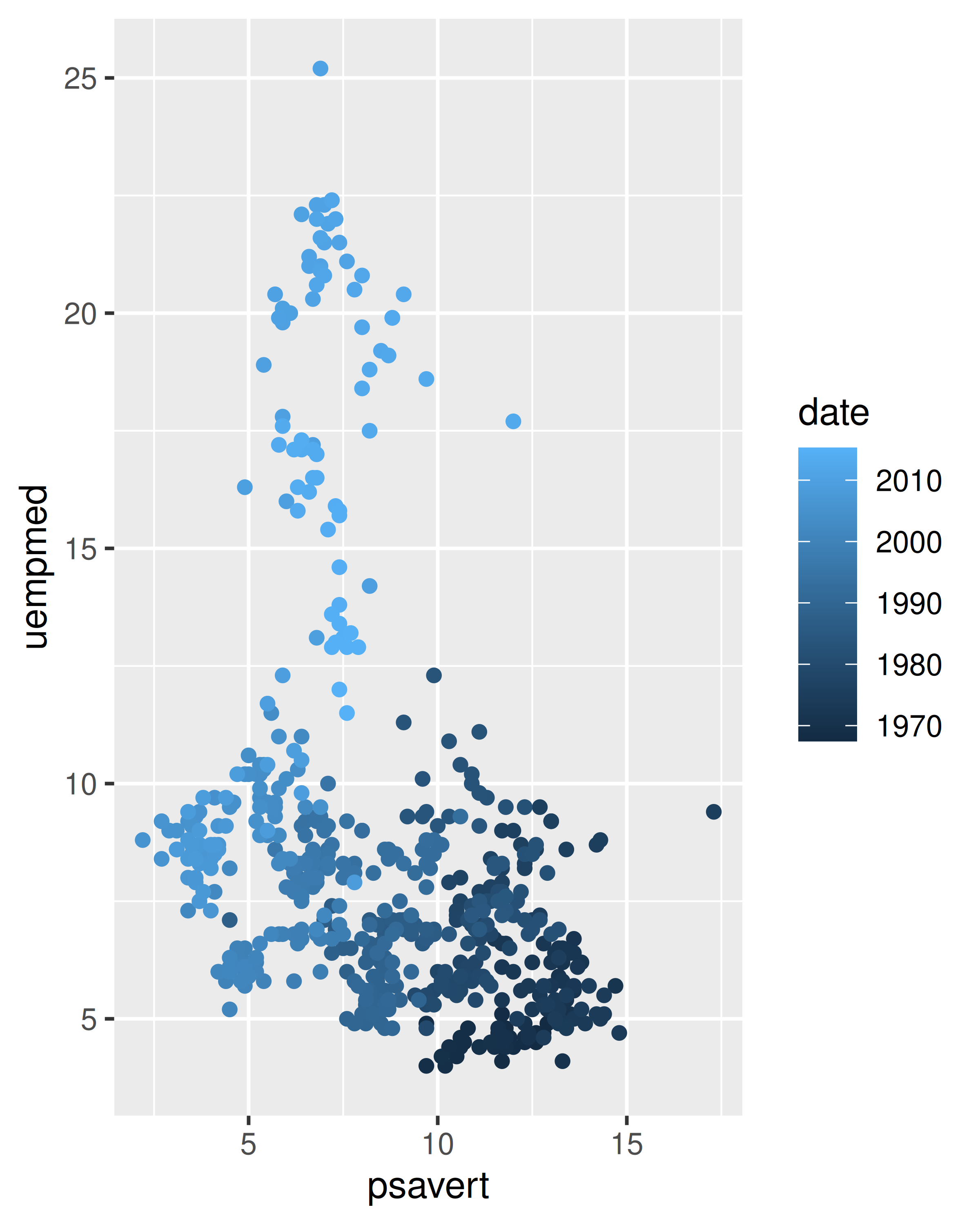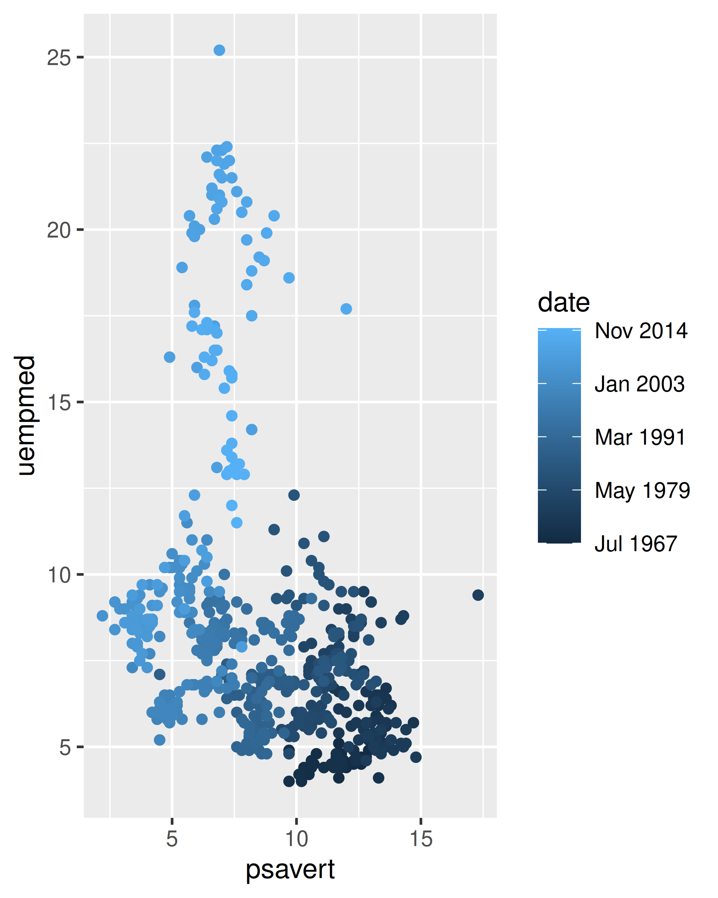base <- ggplot(economics, aes(psavert, uempmed, colour = date)) +