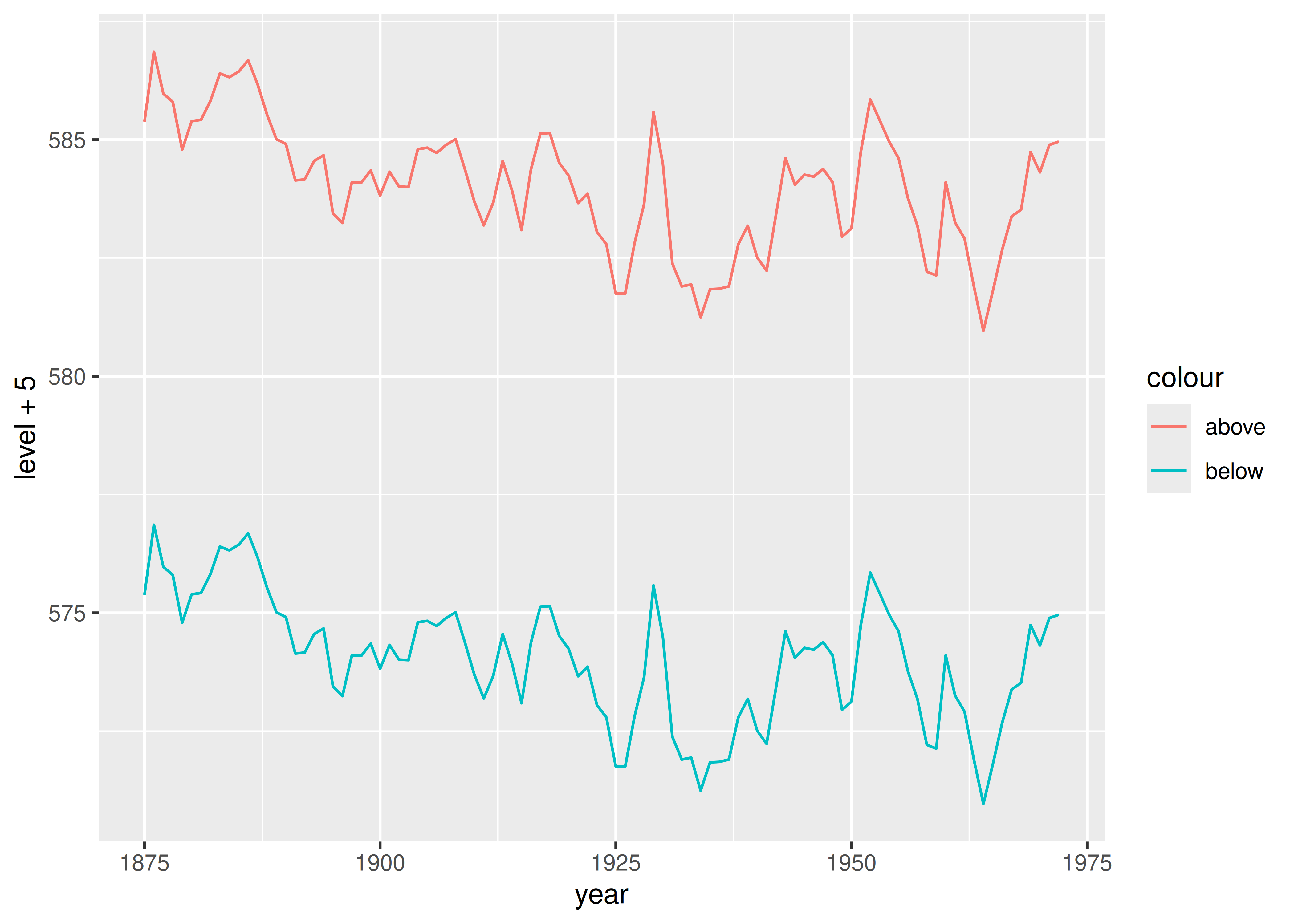 geom_line(aes(y = level + 5, colour = "above")) +
