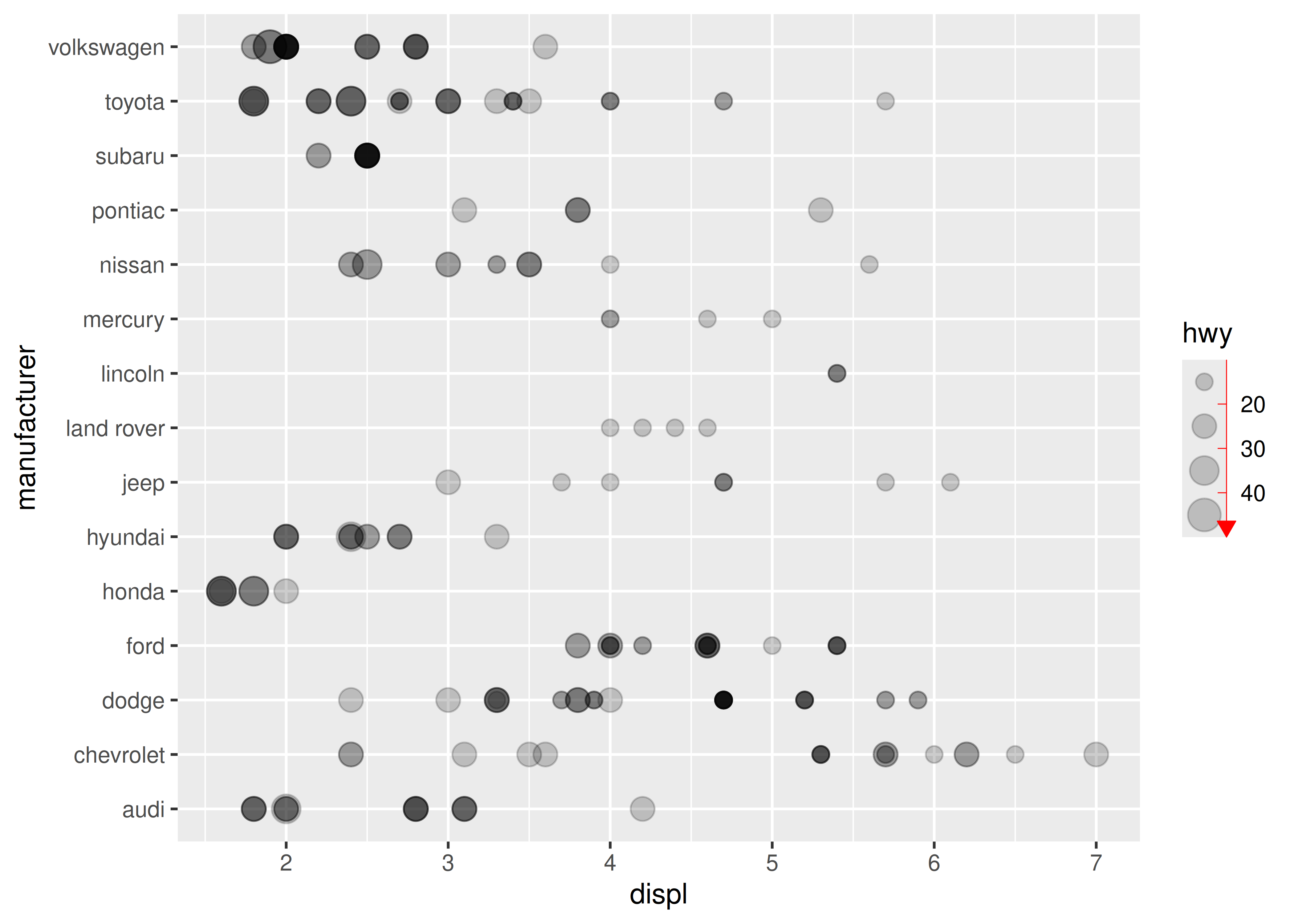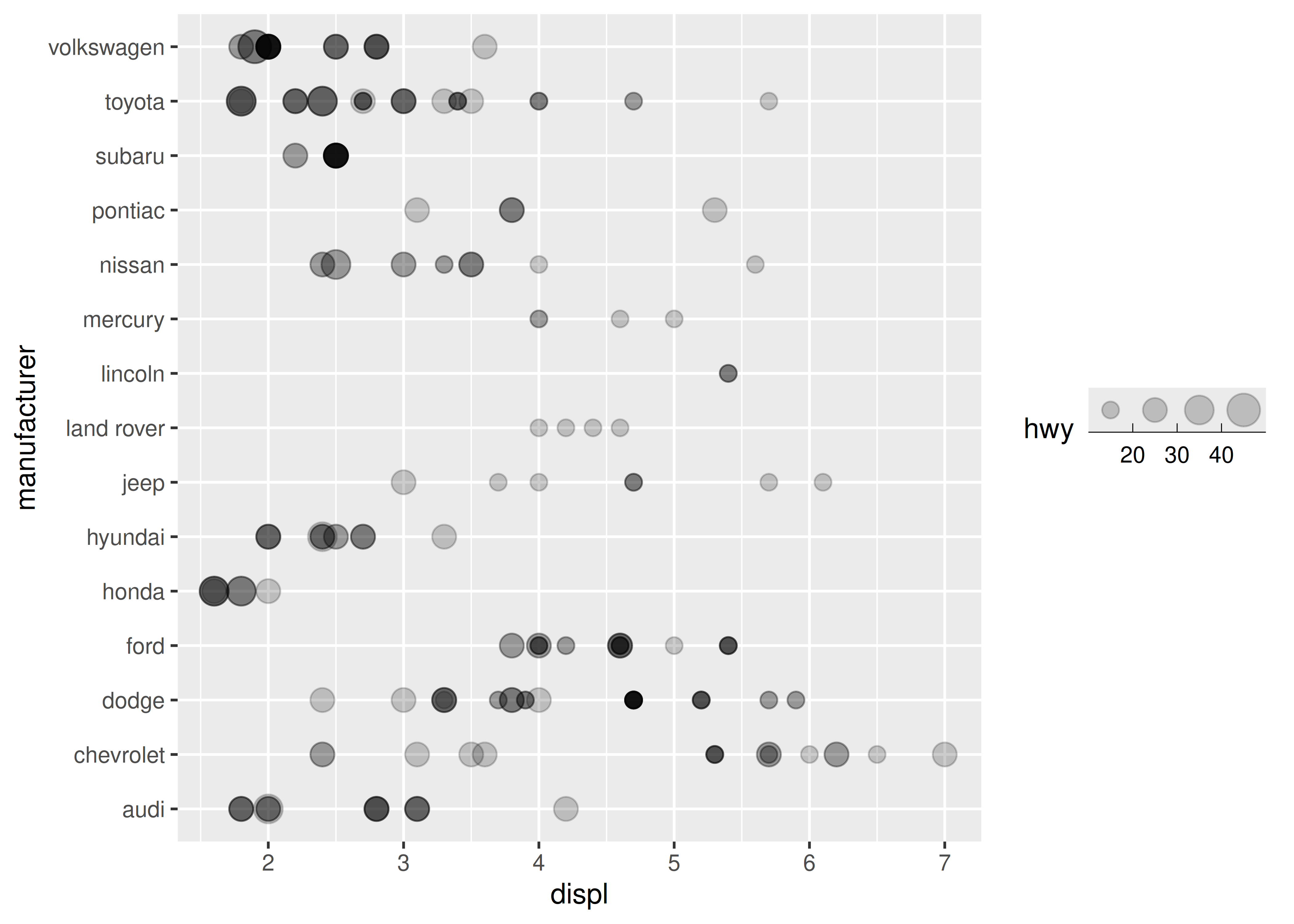 base <- ggplot(mpg, aes(displ, manufacturer, size = hwy)) +