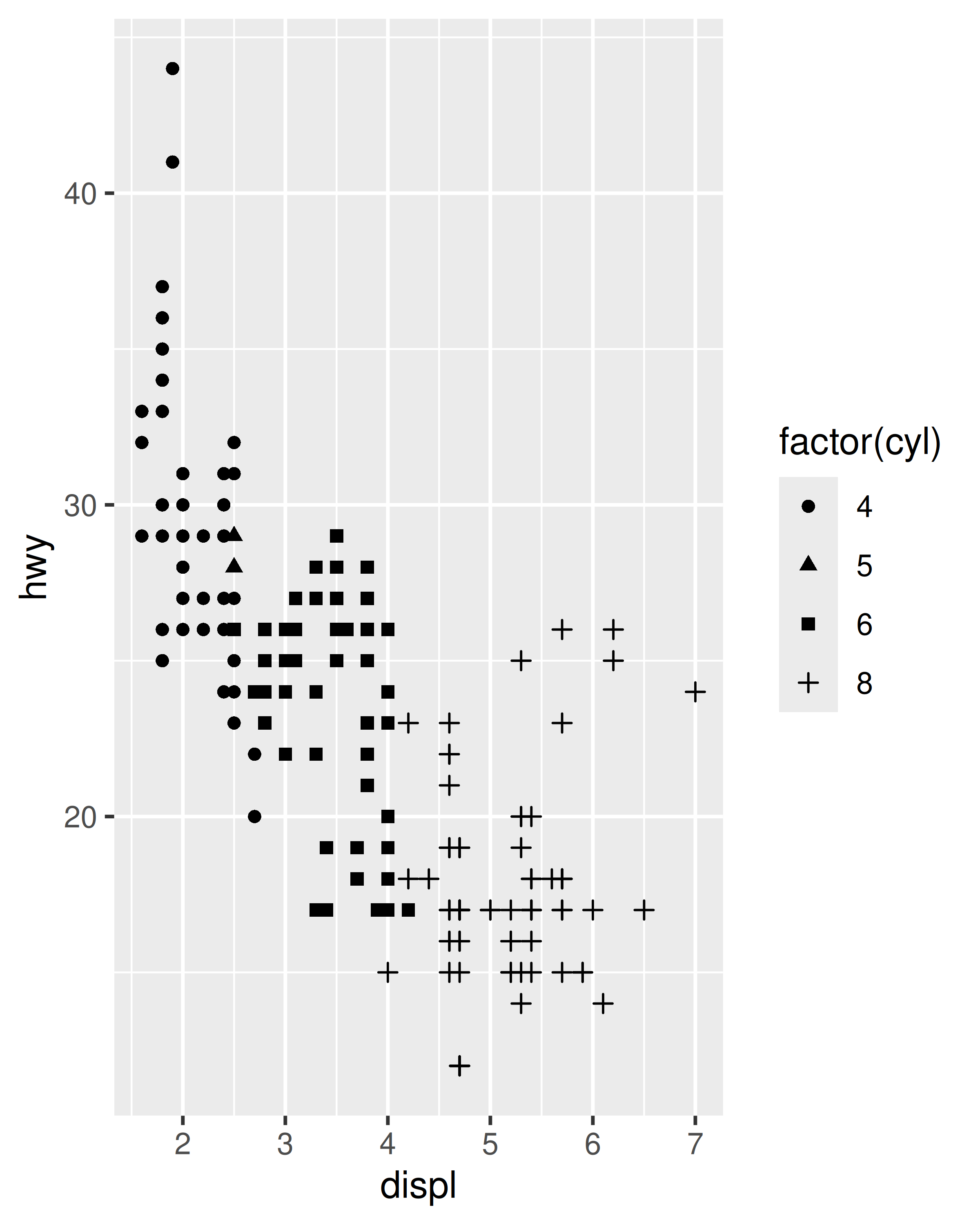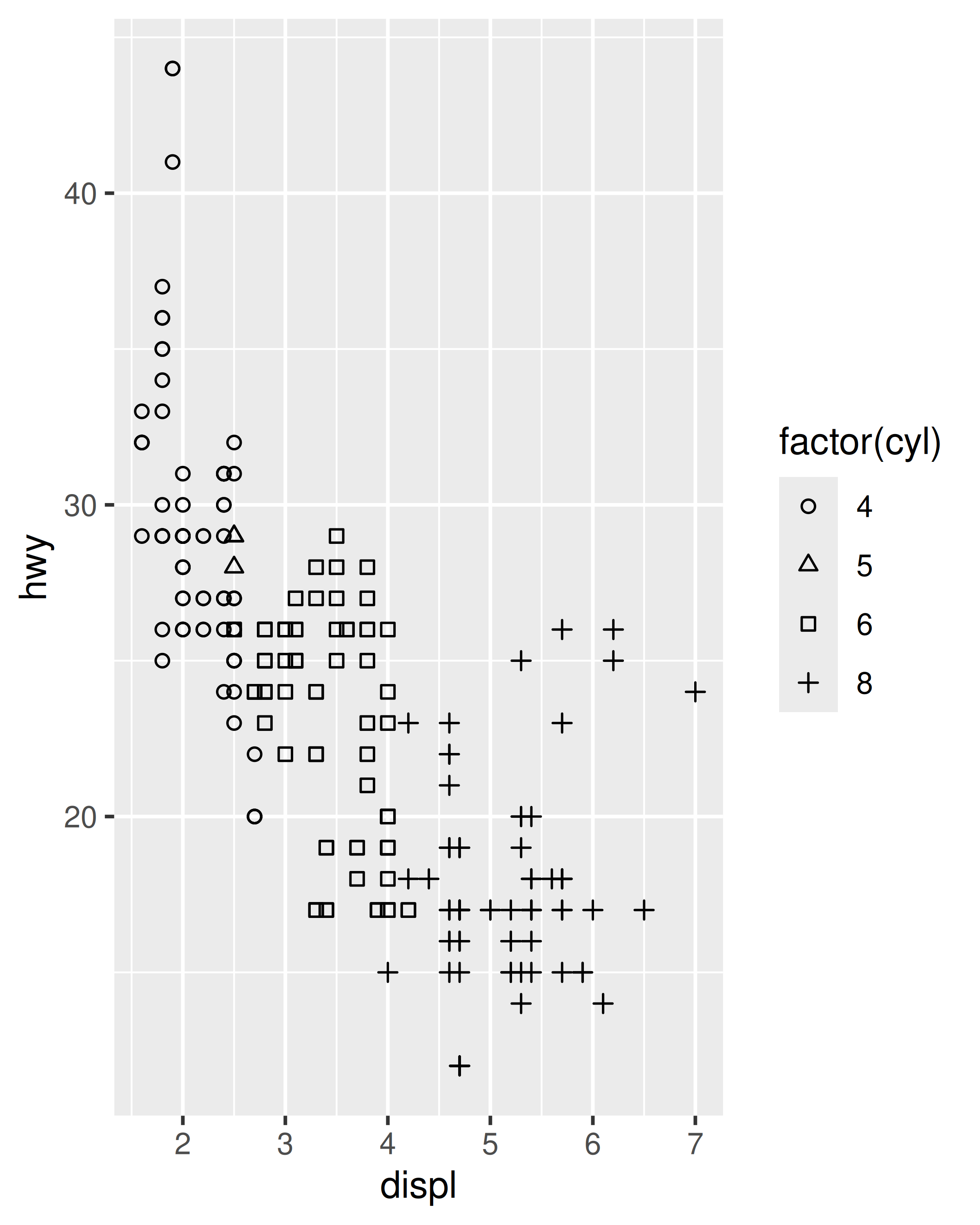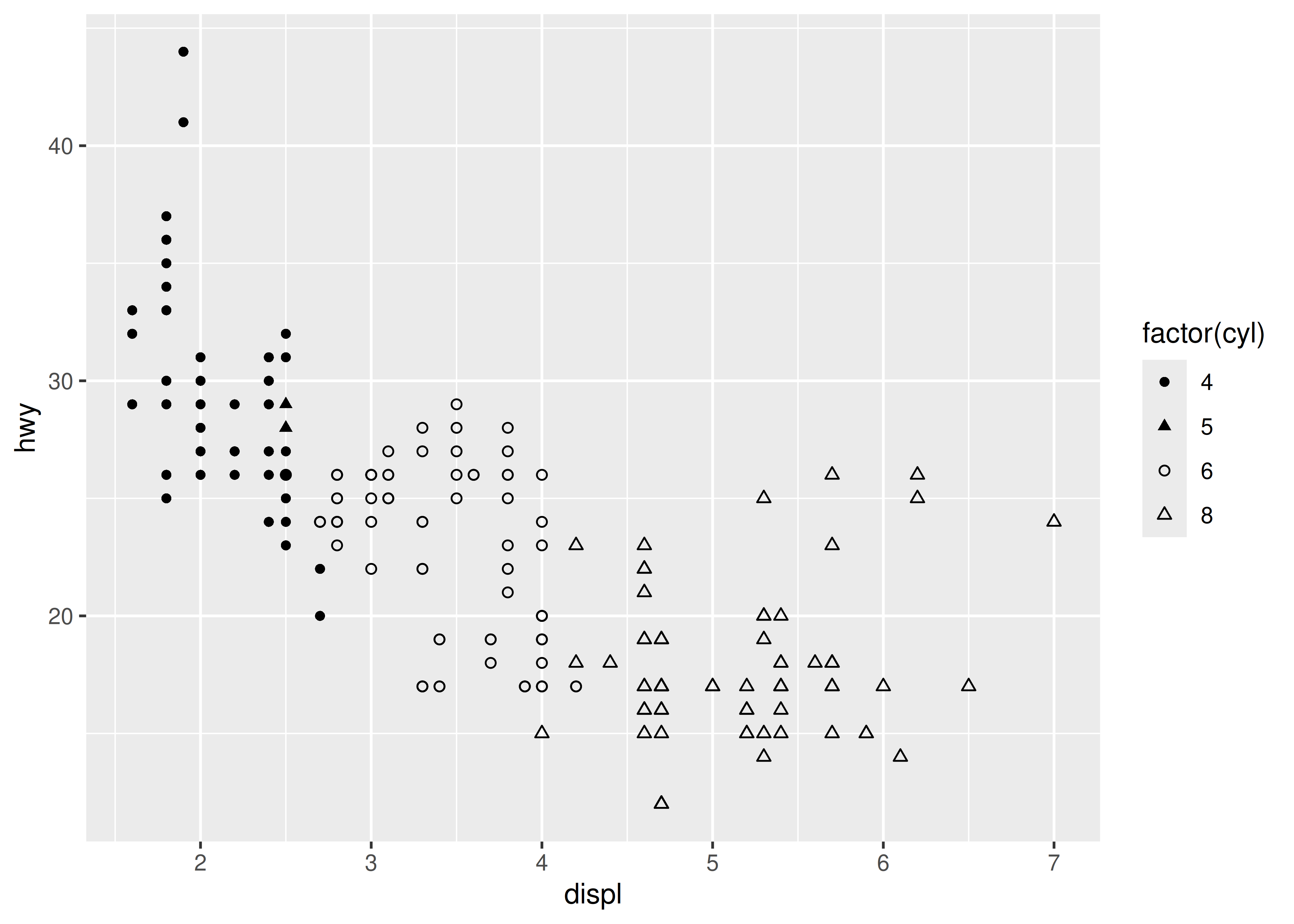 base <- ggplot(mpg, aes(displ, hwy, shape = factor(cyl))) +