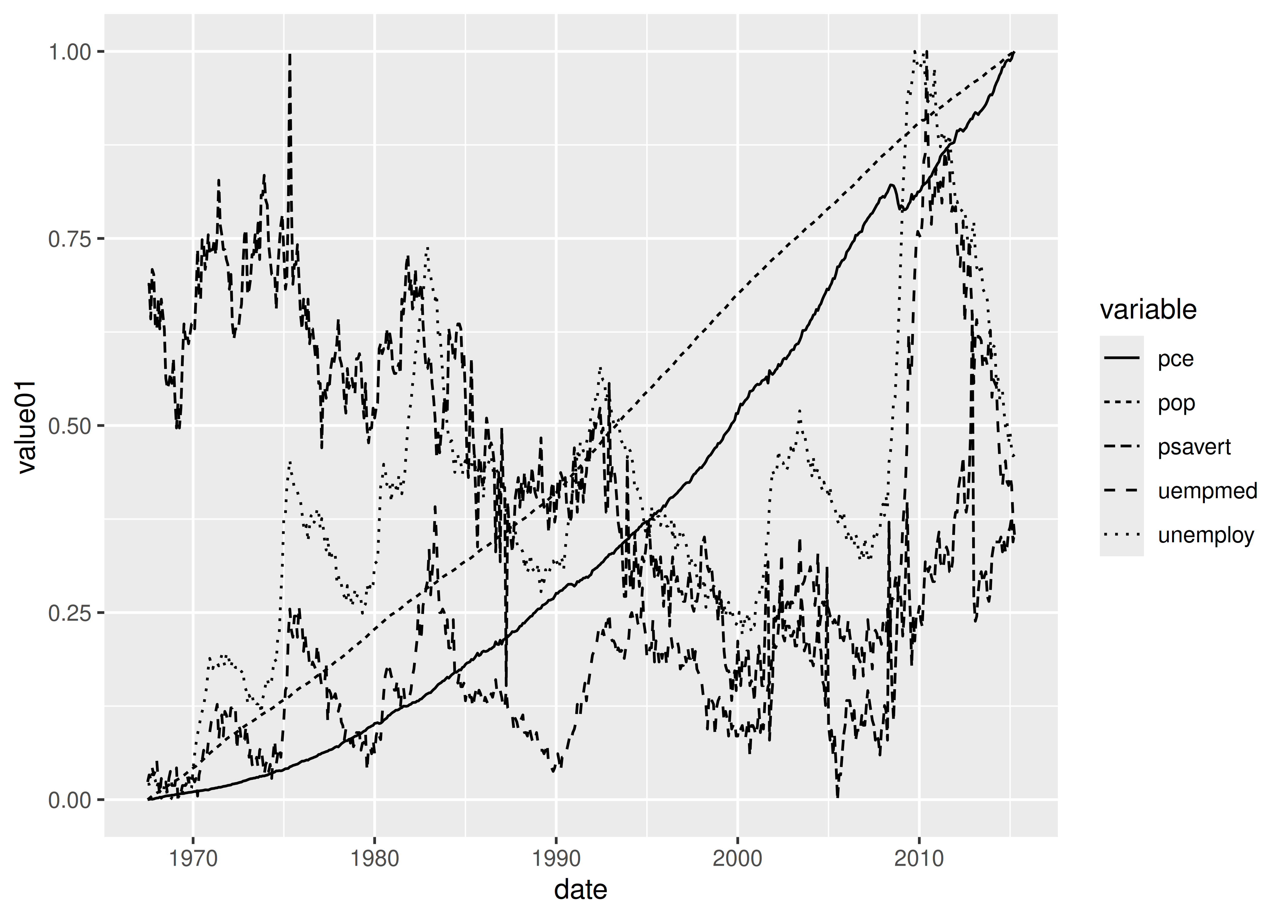 ggplot(economics_long, aes(date, value01, linetype = variable)) +
