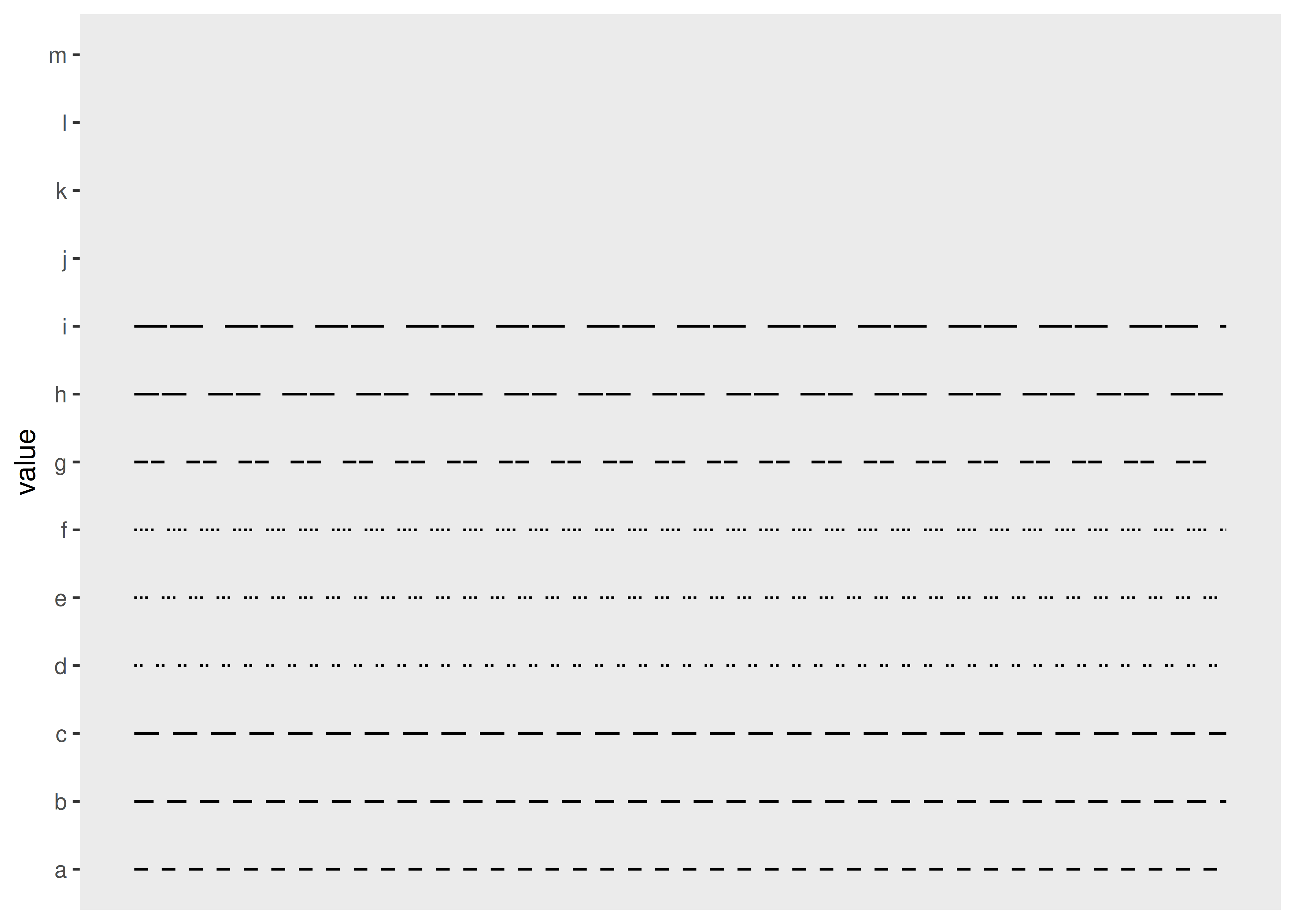 Es posible asignar una variable a la estética del tipo de línea en ggplot2. Esto funciona mejor para variables discretas con una pequeña cantidad de categorías, y scale_linetype() es un alias para scale_linetype_discrete(). Las variables continuas no se pueden asignar a tipos de línea a menos que se use scale_linetype_binned(): aunque existe una función scale_linetype_continuous(), lo único que hace es producir un error. Para ver por qué la estética del tipo de línea es adecuada sólo para casos con unas pocas categorías, considere este gráfico: