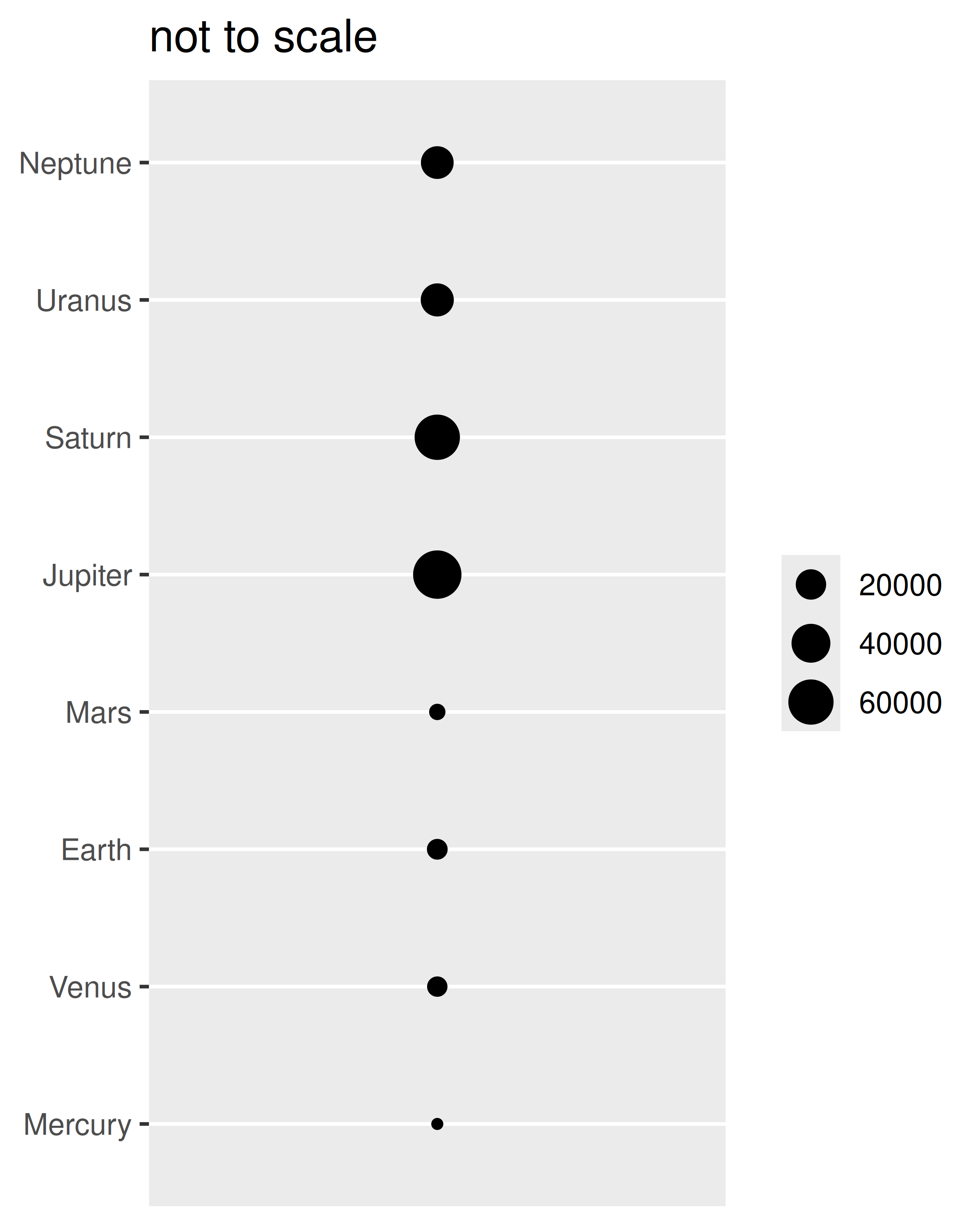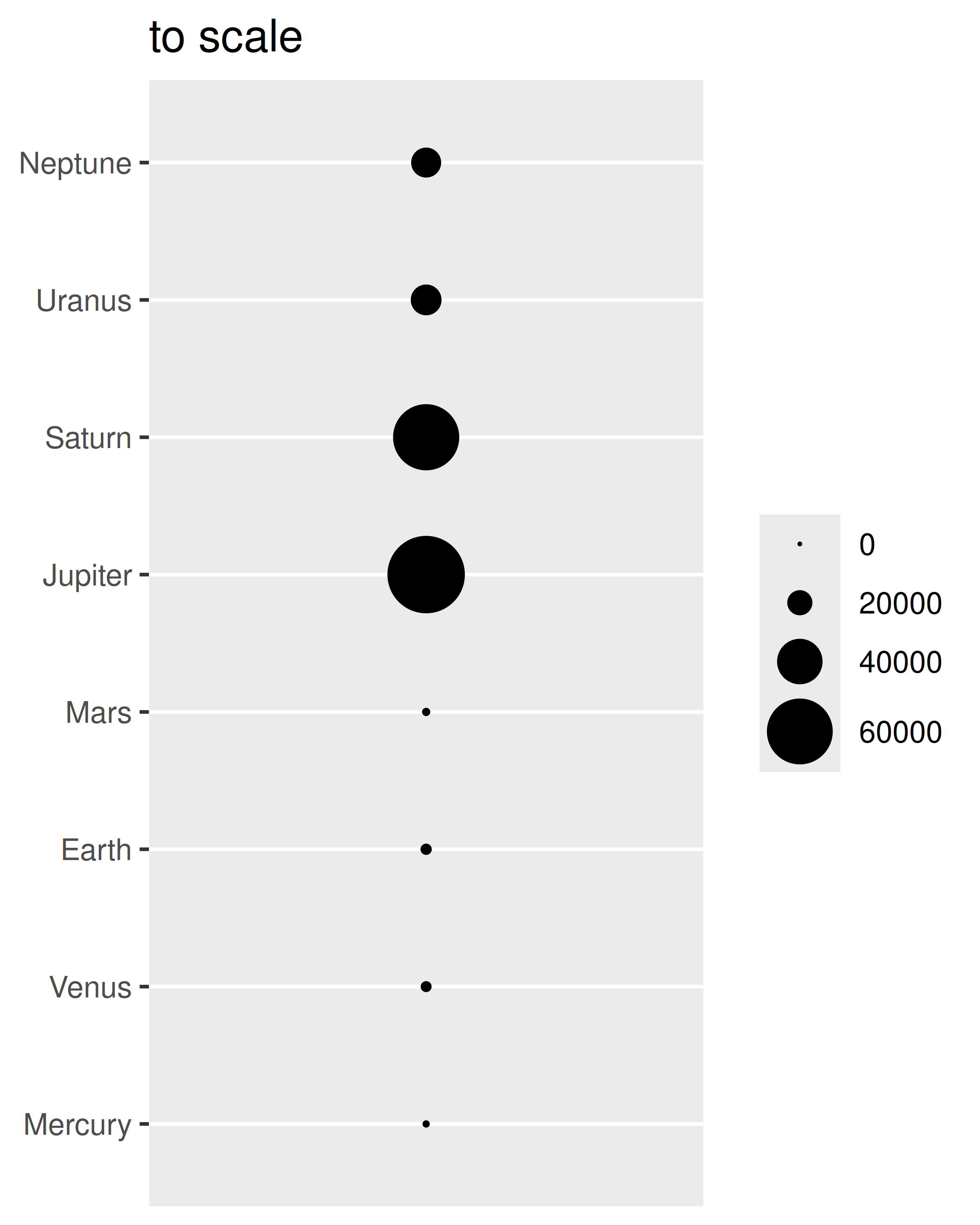 En este caso, un gráfico que utiliza la estética del tamaño para representar el radio de los planetas debe usar scale_radius() en lugar del scale_size() predeterminado. También es importante en este caso establecer los límites de escala para que un planeta con radio 0 se dibuje con un disco con radio 0.