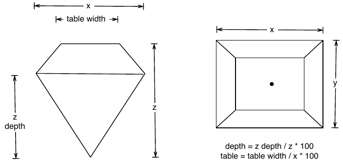 Los datos contienen las cuatro C de la calidad del diamante: quilates, talla, color y claridad; y cinco medidas físicas: profundidad, tabla, x, y y z, como se describe en la siguiente figura.
