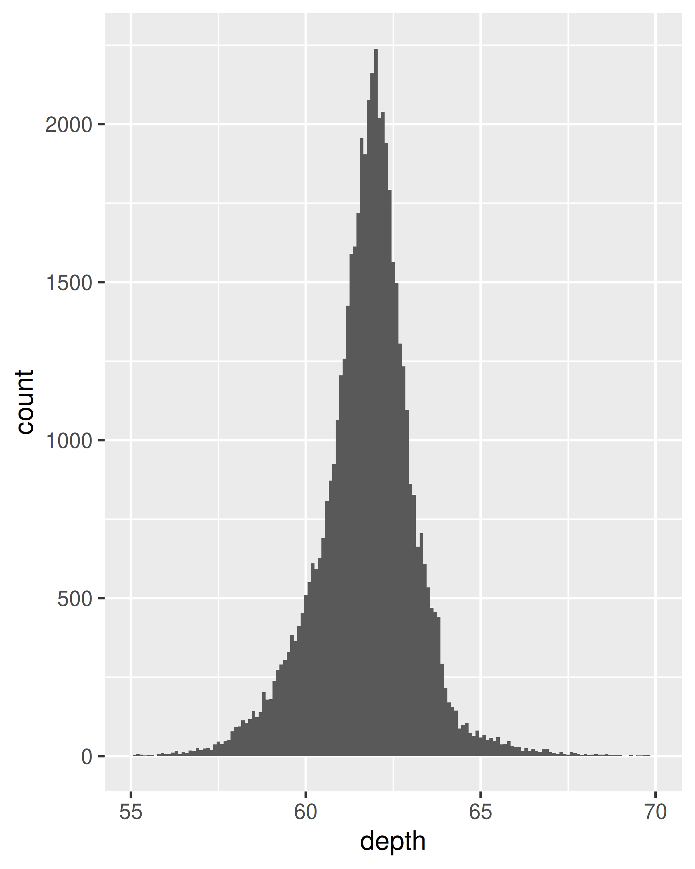 Es importante experimentar con la agrupación para encontrar una vista reveladora. Puede cambiar el binwidth, especificar el número de bins o especificar la ubicación exacta de los breaks. Nunca confíe en los parámetros predeterminados para obtener una vista reveladora de la distribución. Hacer zoom en el eje x, xlim(55, 70), y seleccionar un ancho de contenedor más pequeño, binwidth = 0.1, revela muchos más detalles.