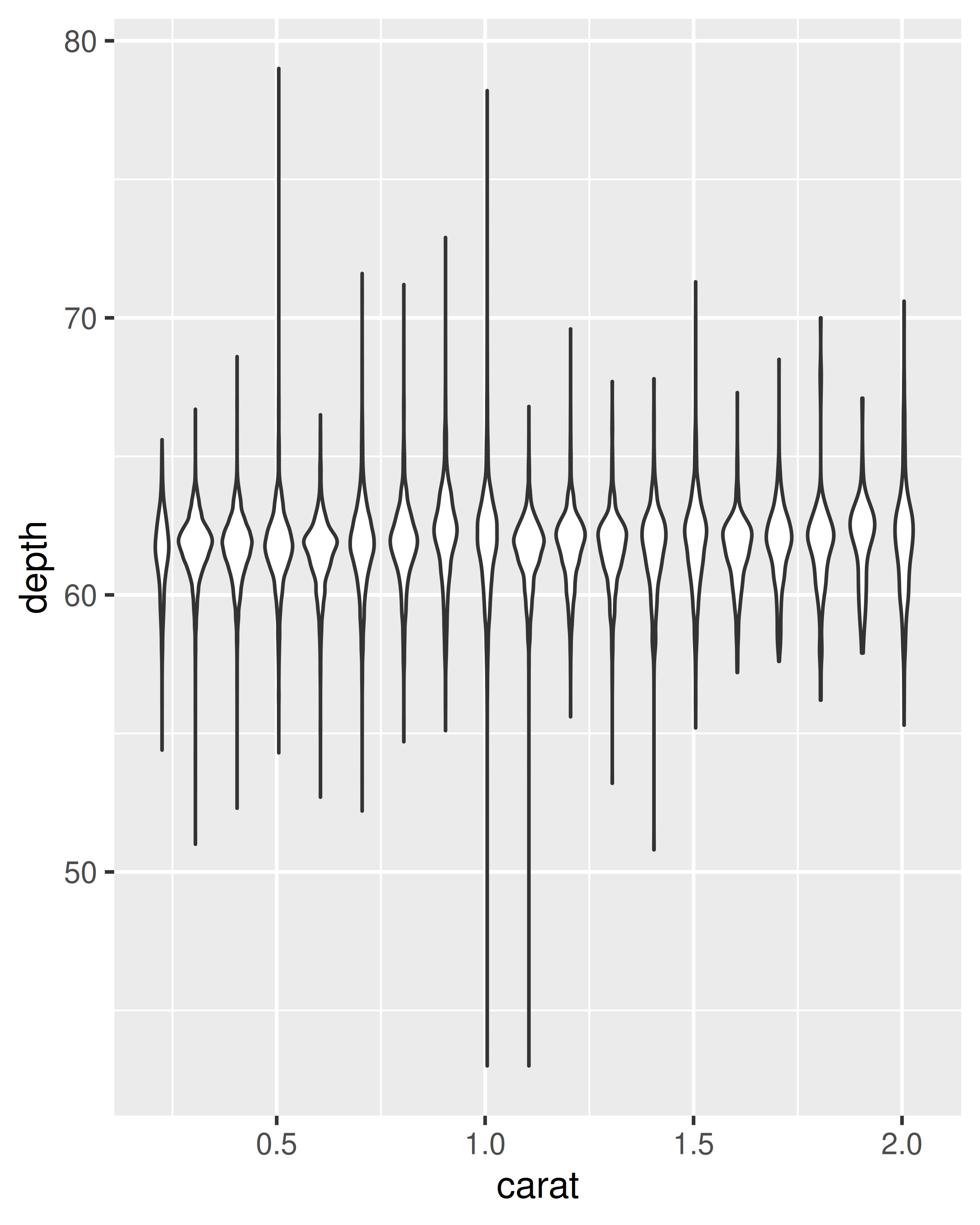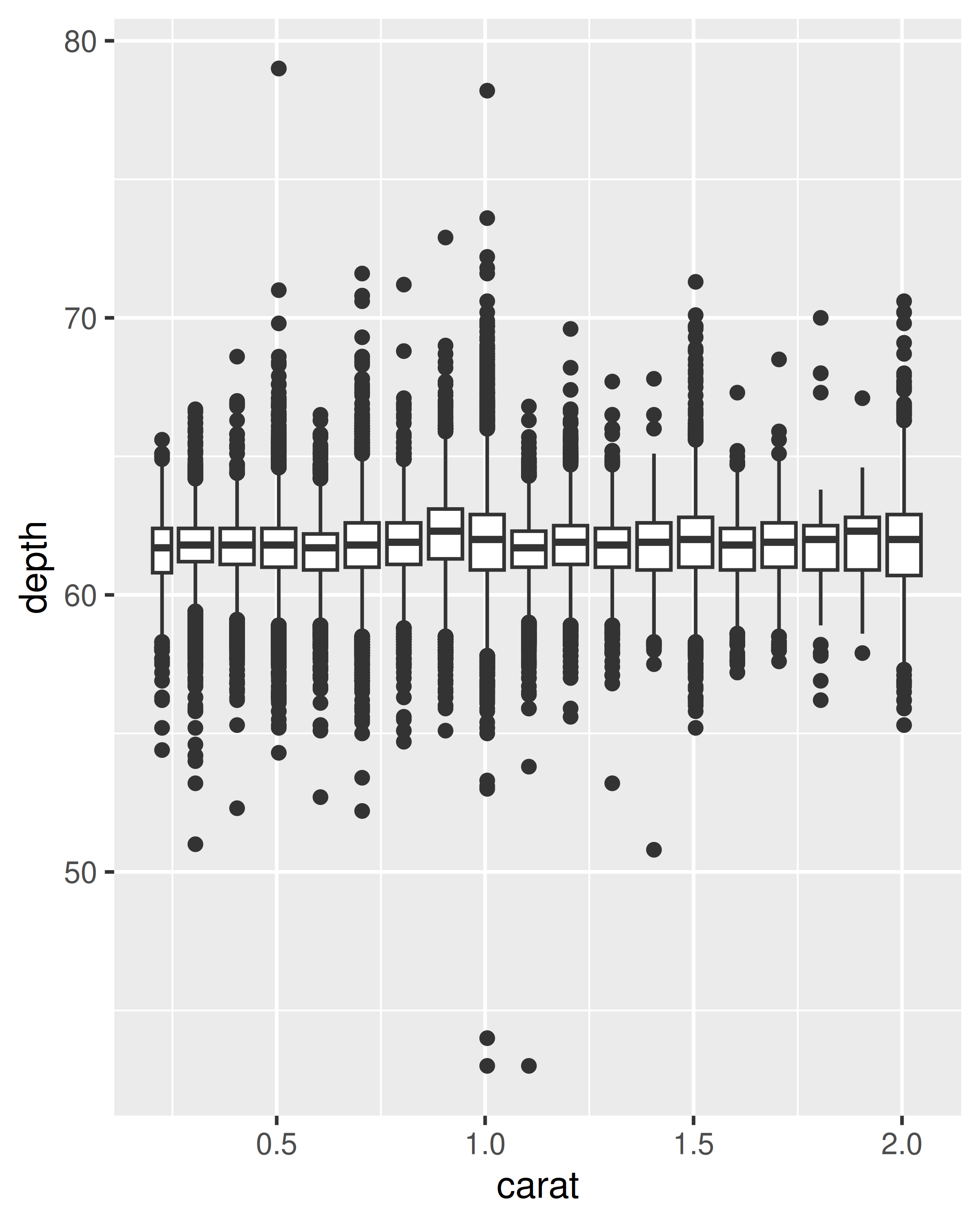 cut_width():ggplot(diamonds, aes(clarity, depth)) + geom_boxplot() ggplot(diamonds, aes(carat, depth)) + geom_boxplot(aes(group = cut_width(carat, 0.1))) + xlim(NA, 2.05) #> Warning: Removed 997 rows containing missing values or values outside the scale range #> (`stat_boxplot()`).