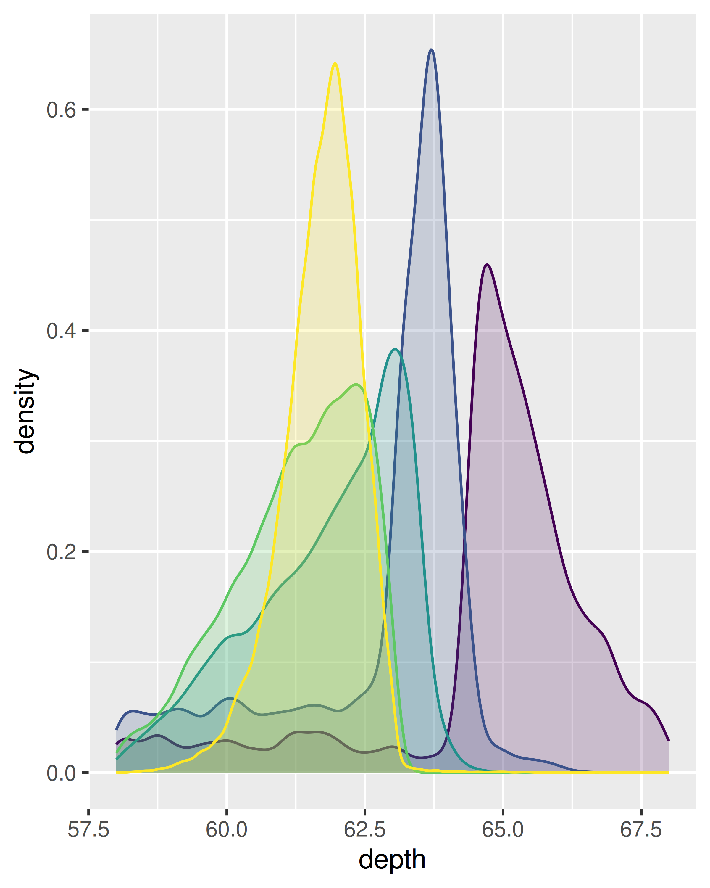 ggplot(diamonds, aes(depth, fill = cut, colour = cut)) +