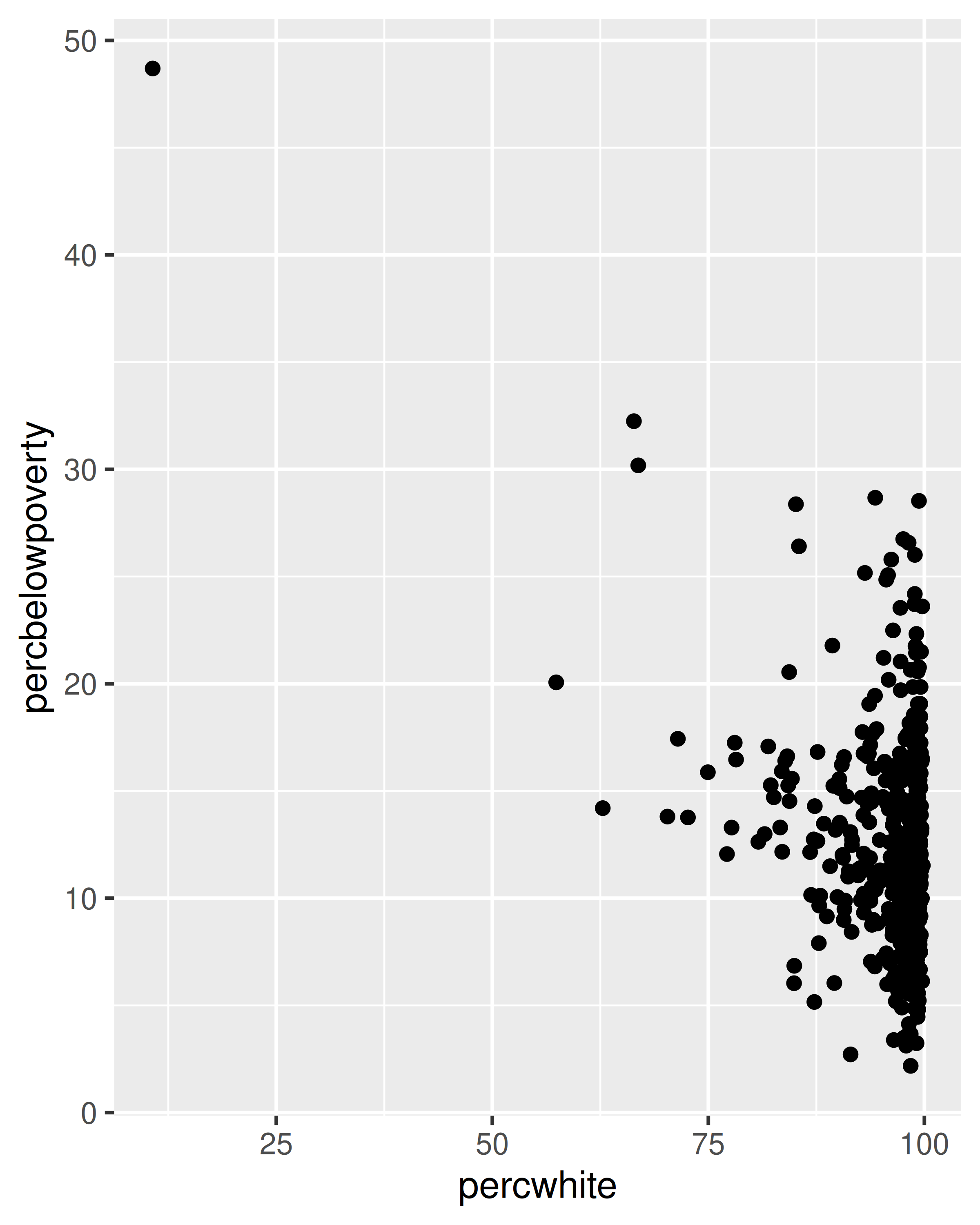 ggplot(midwest, aes(percwhite, percbelowpoverty)) +