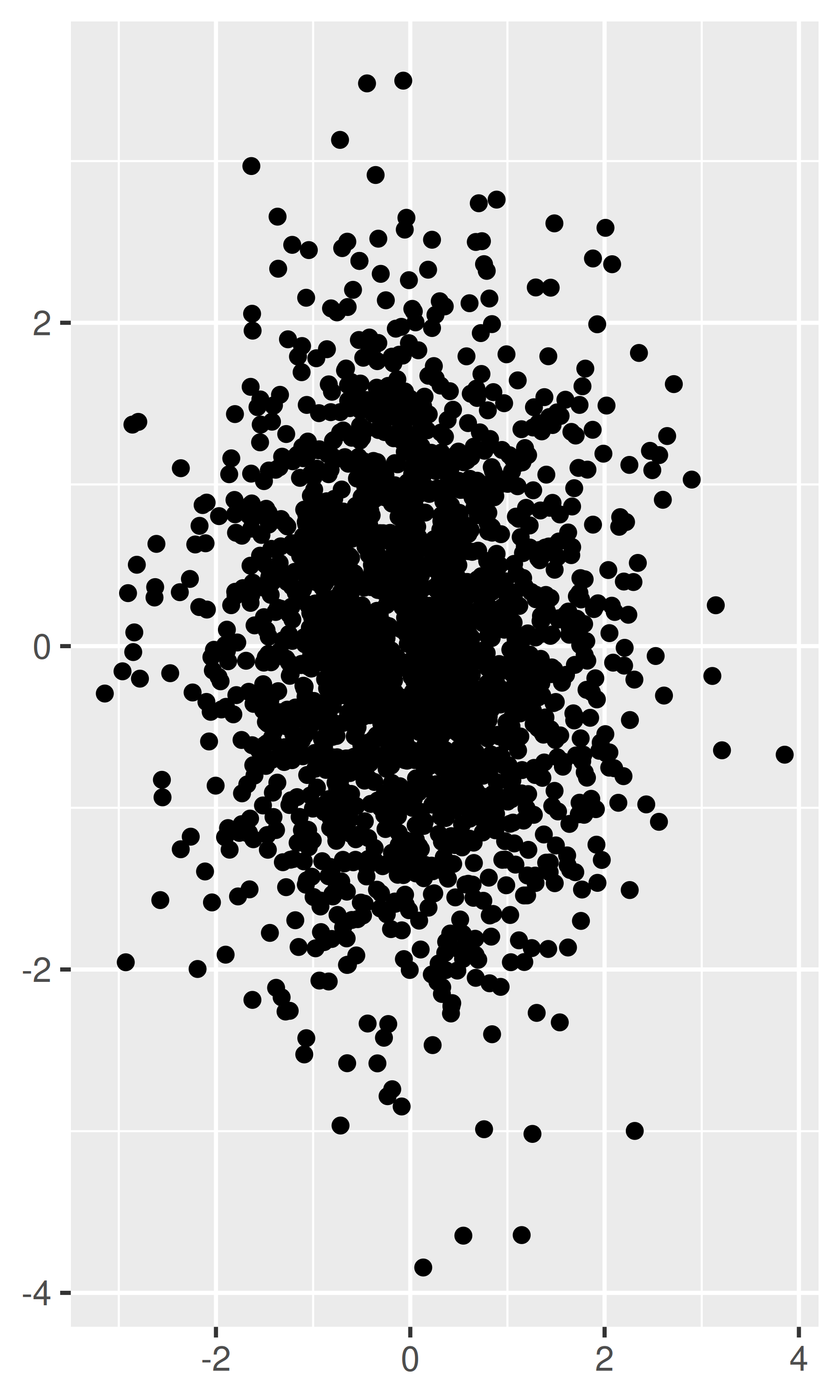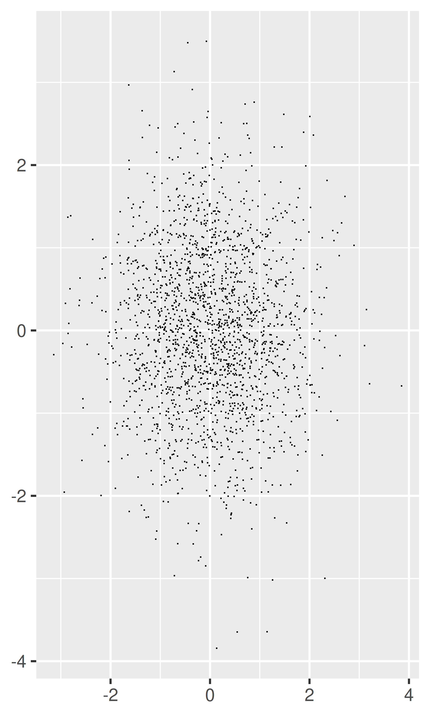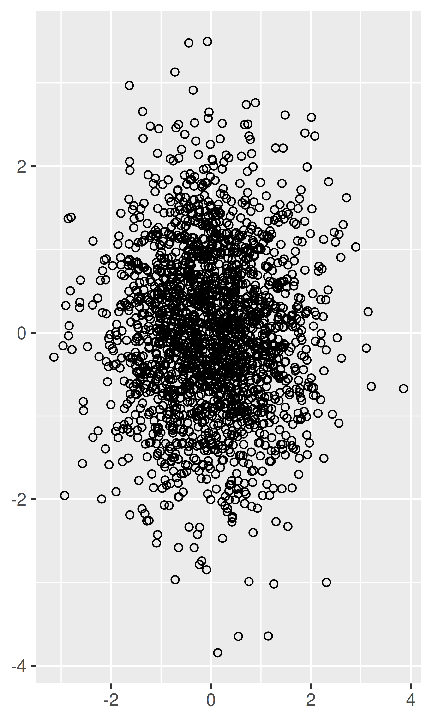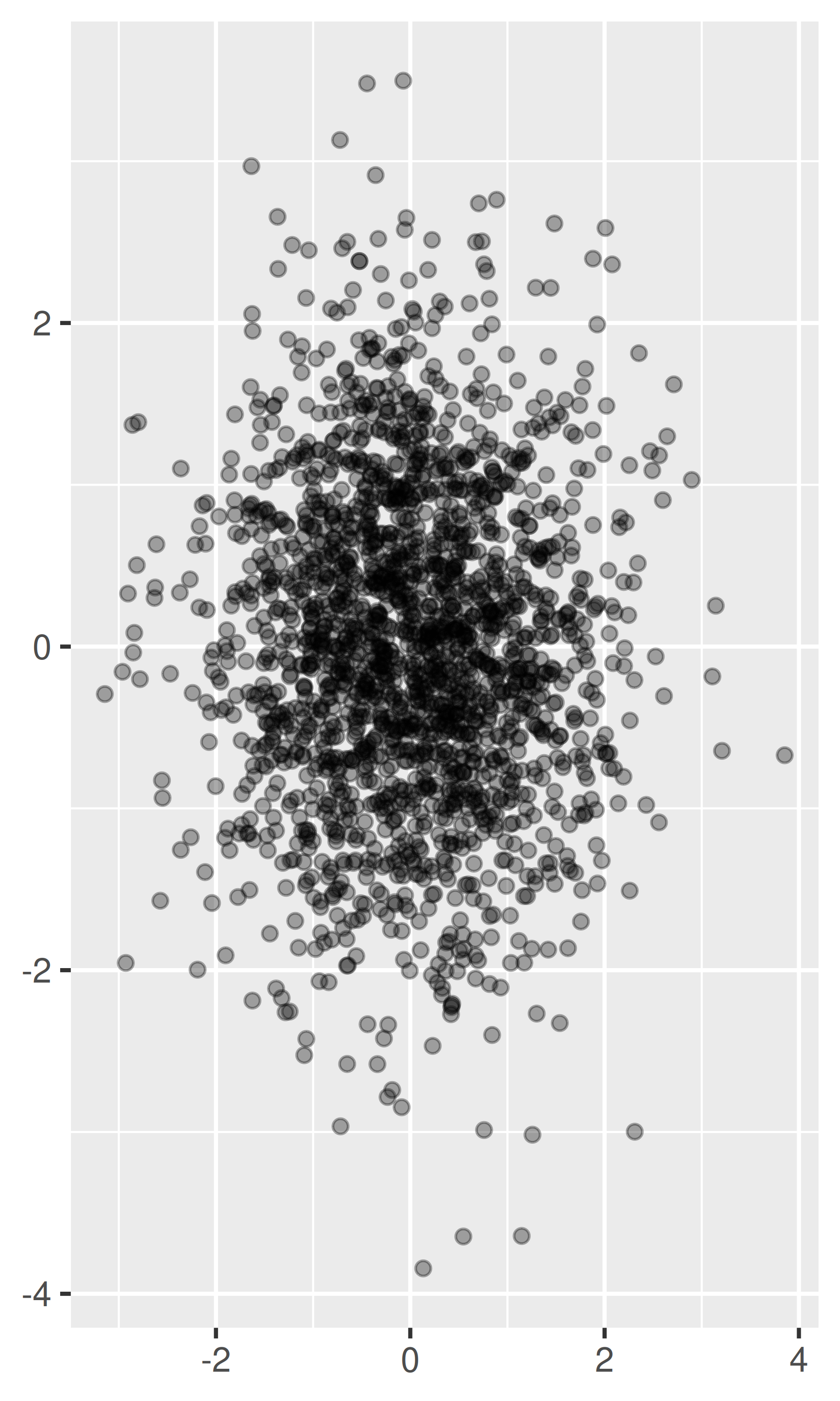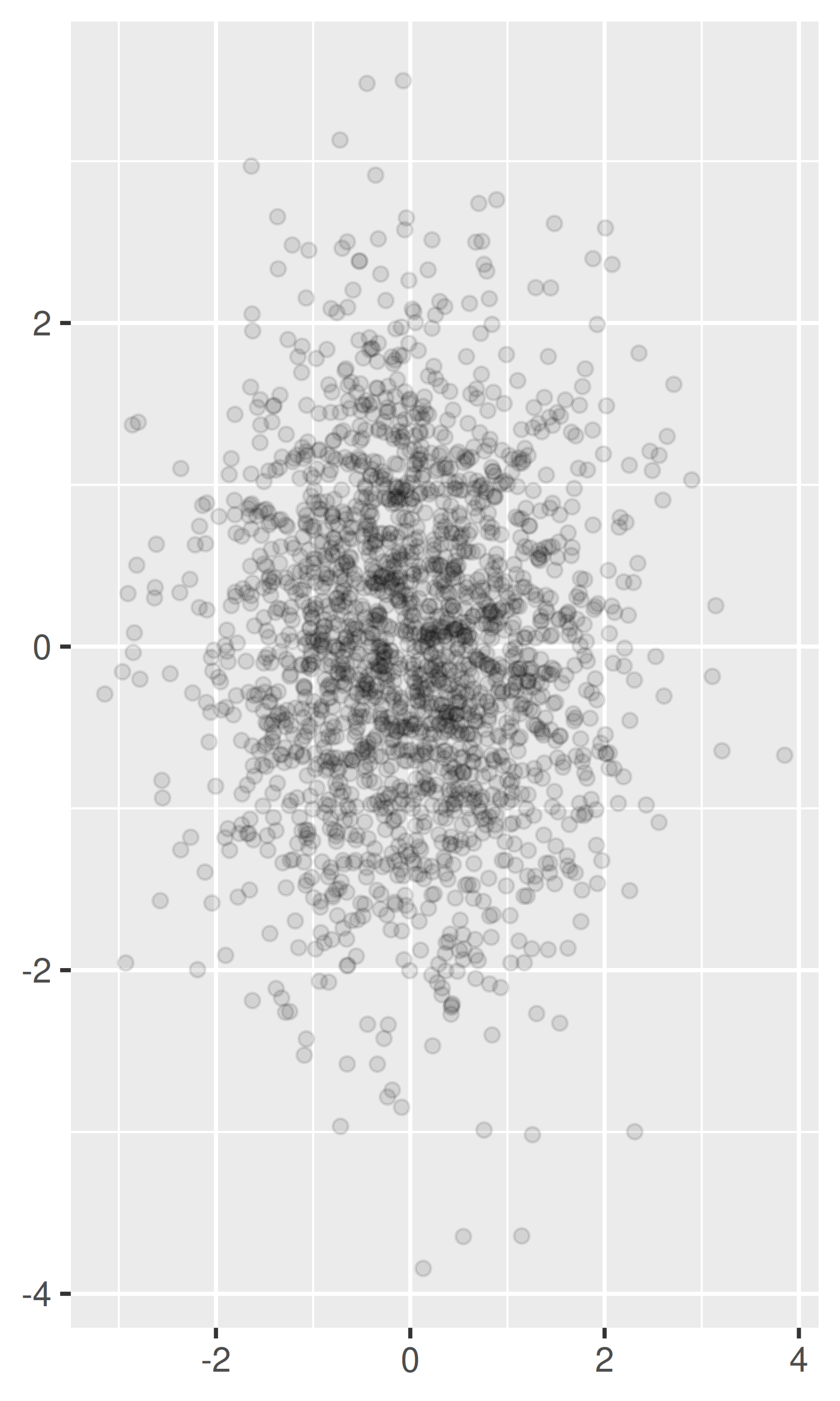 df <- data.frame(x = rnorm(2000), y = rnorm(2000)) norm <- ggplot(df, aes(x, y)) + xlab(NULL) + ylab(NULL) norm + geom_point() norm + geom_point(shape = 1) # círculos huecos norm + geom_point(shape = ".") # Tamaño de píxel