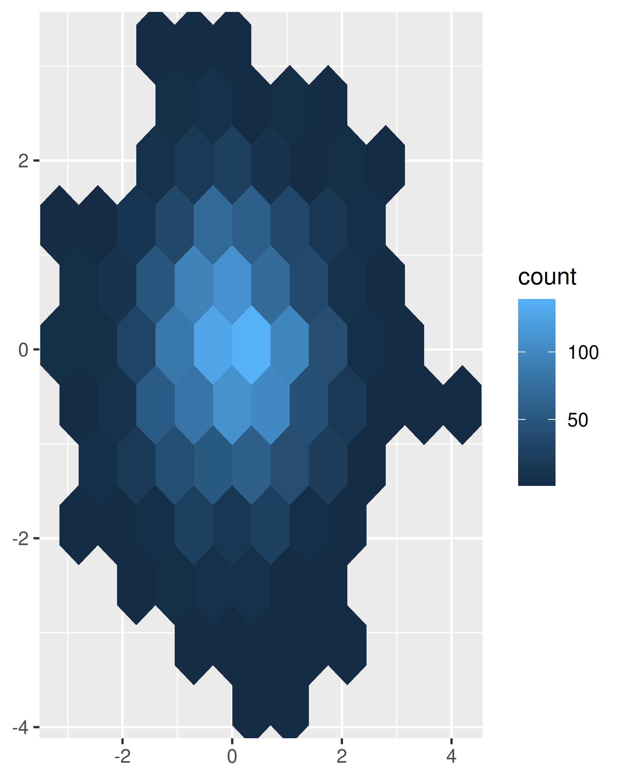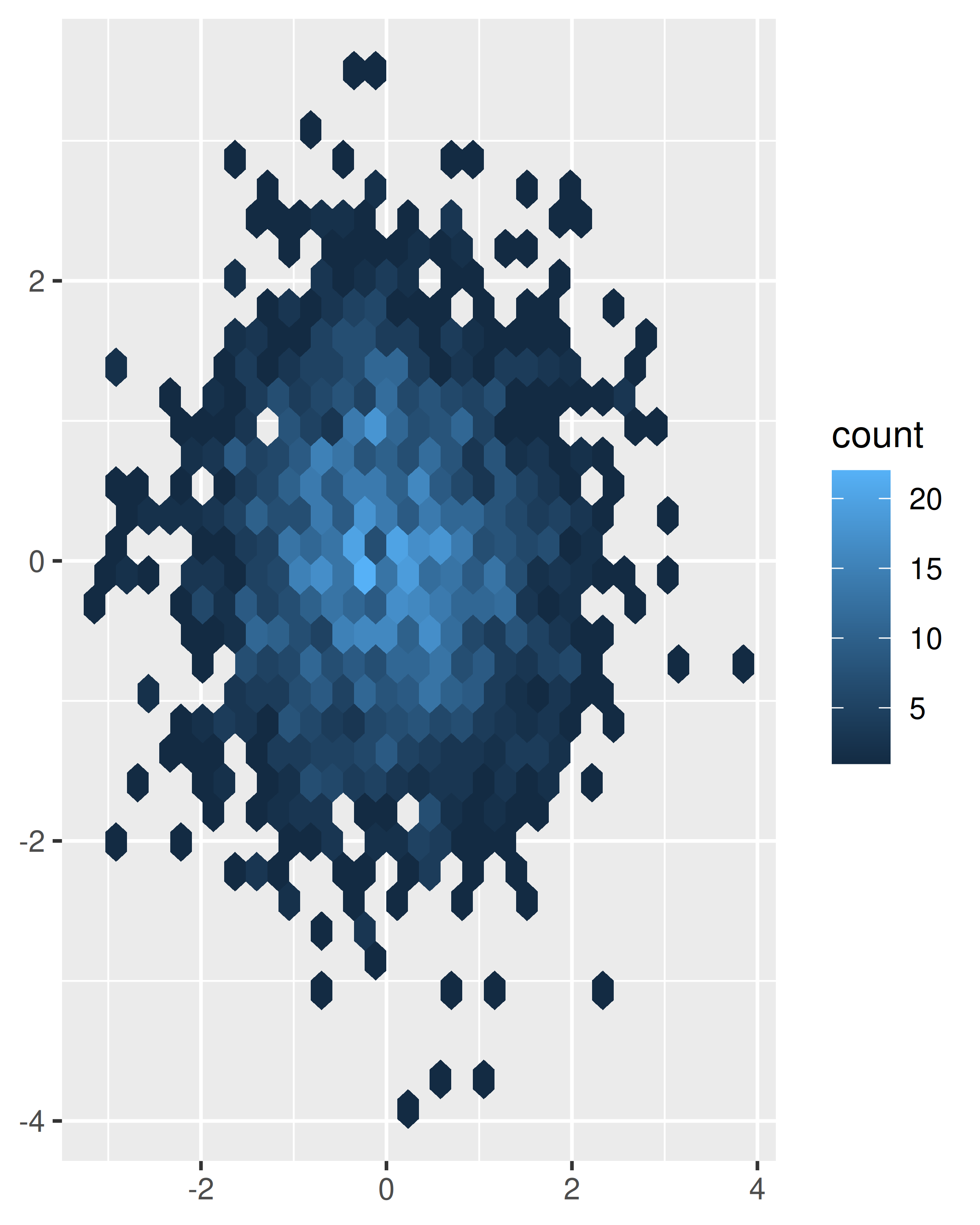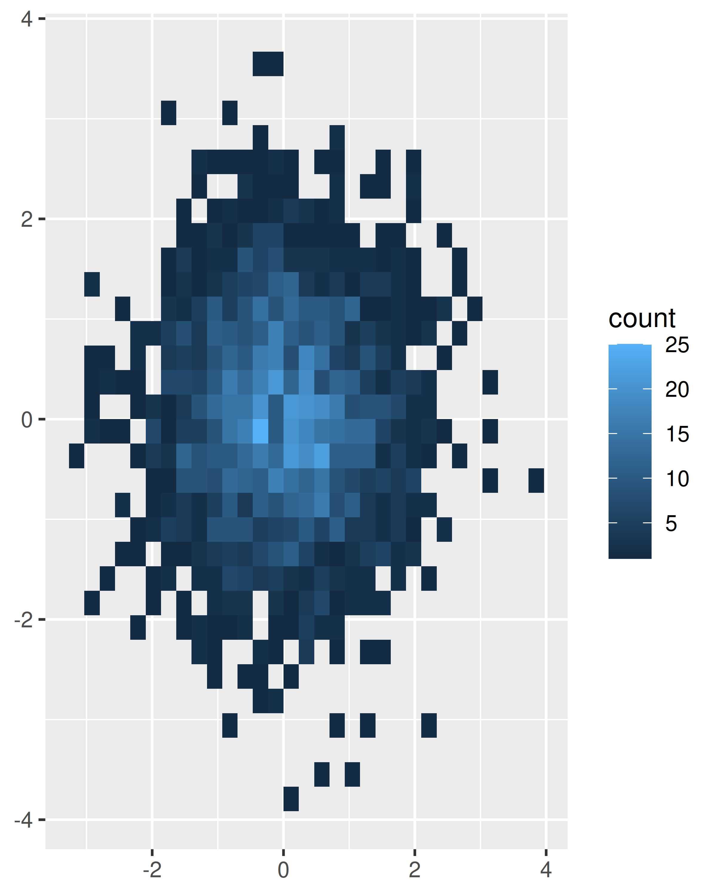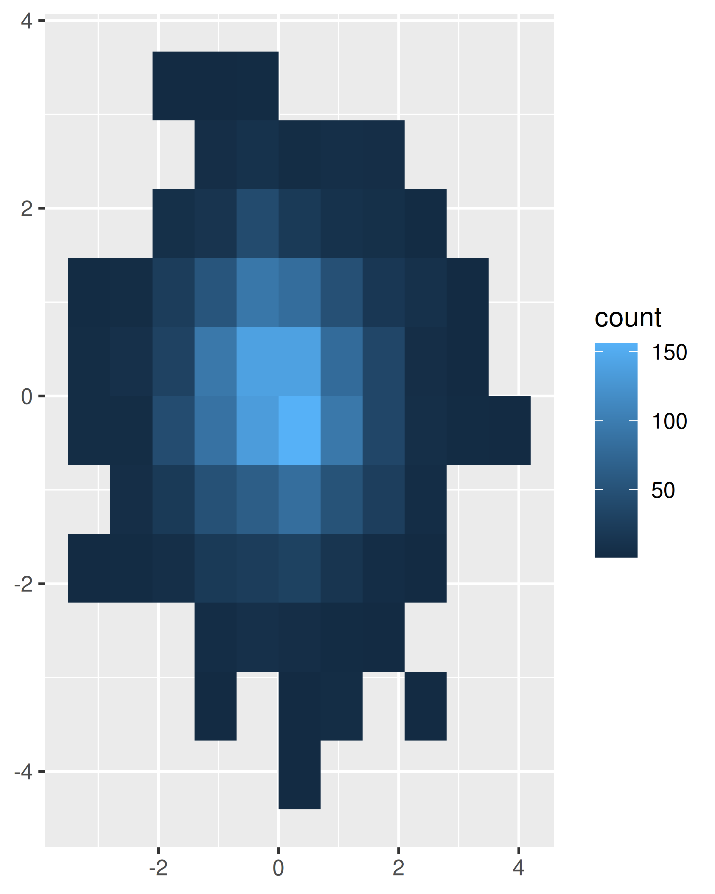 binsybinwidthpara controlar el número y el tamaño de los contenedores.norm + geom_bin2d() norm + geom_bin2d(bins = 10)
