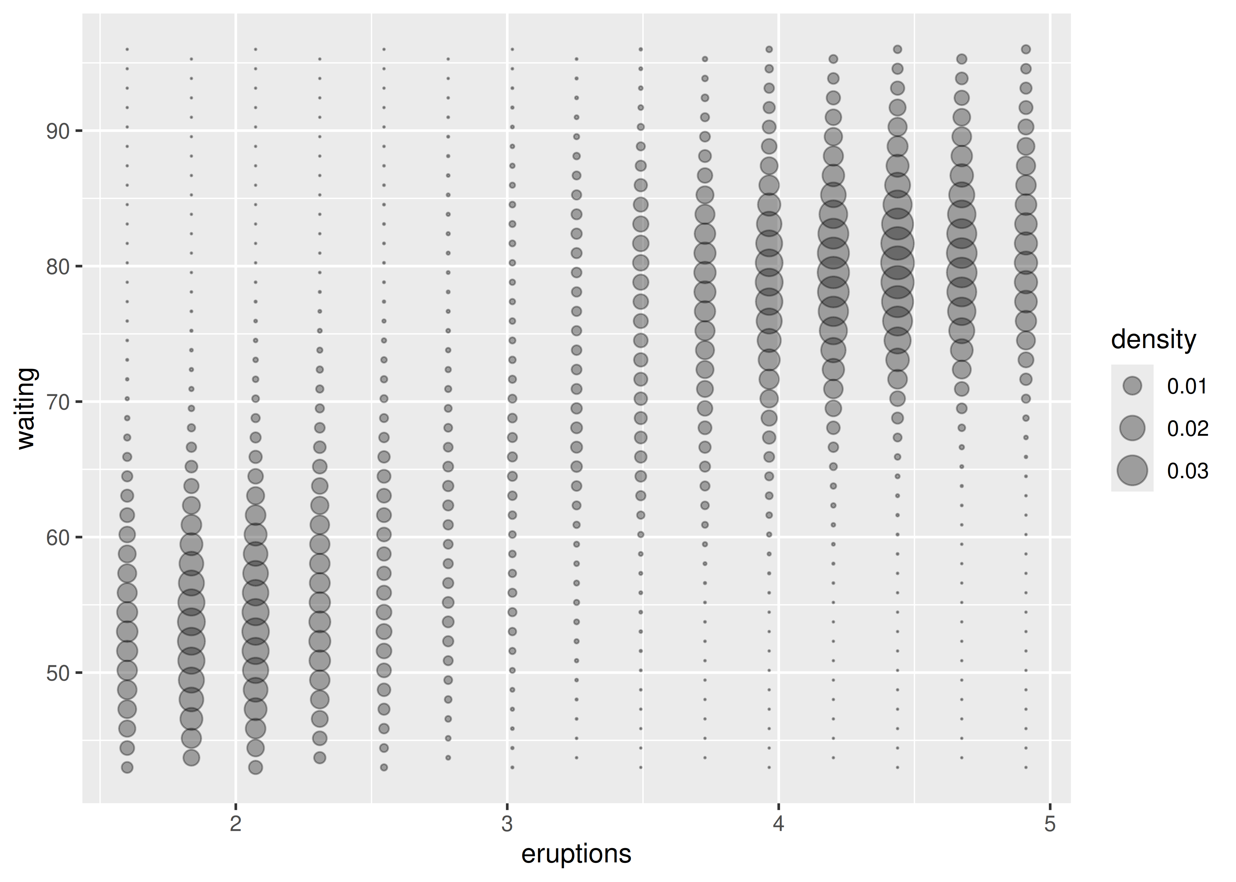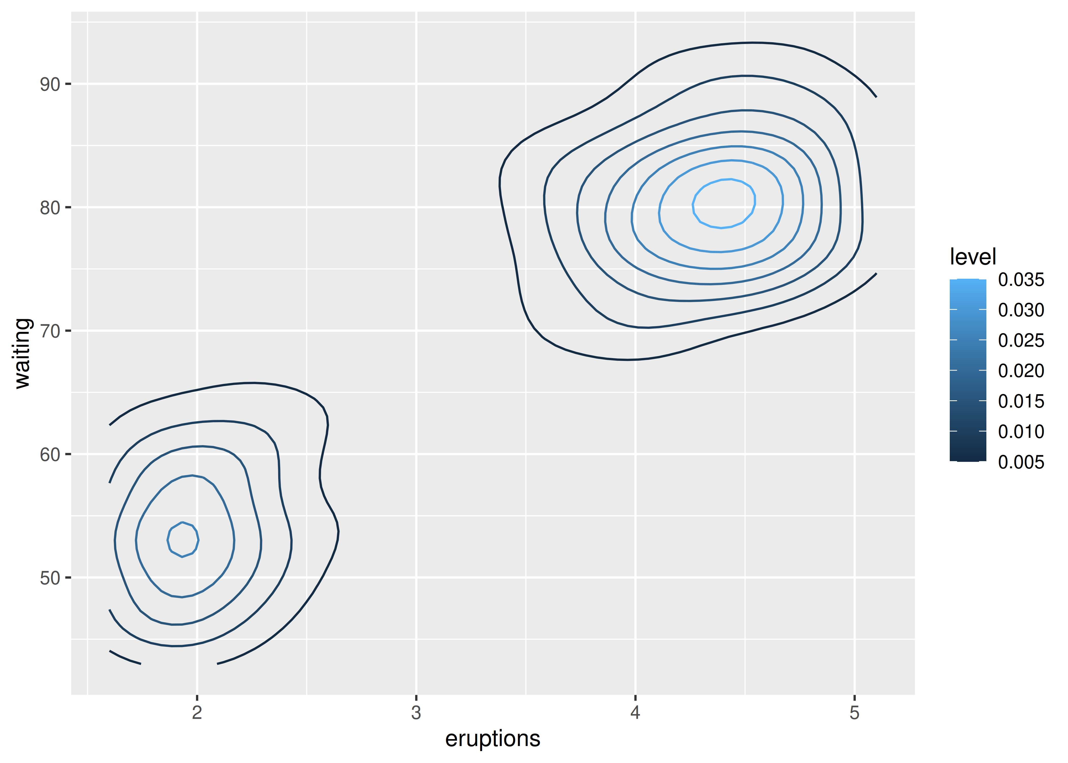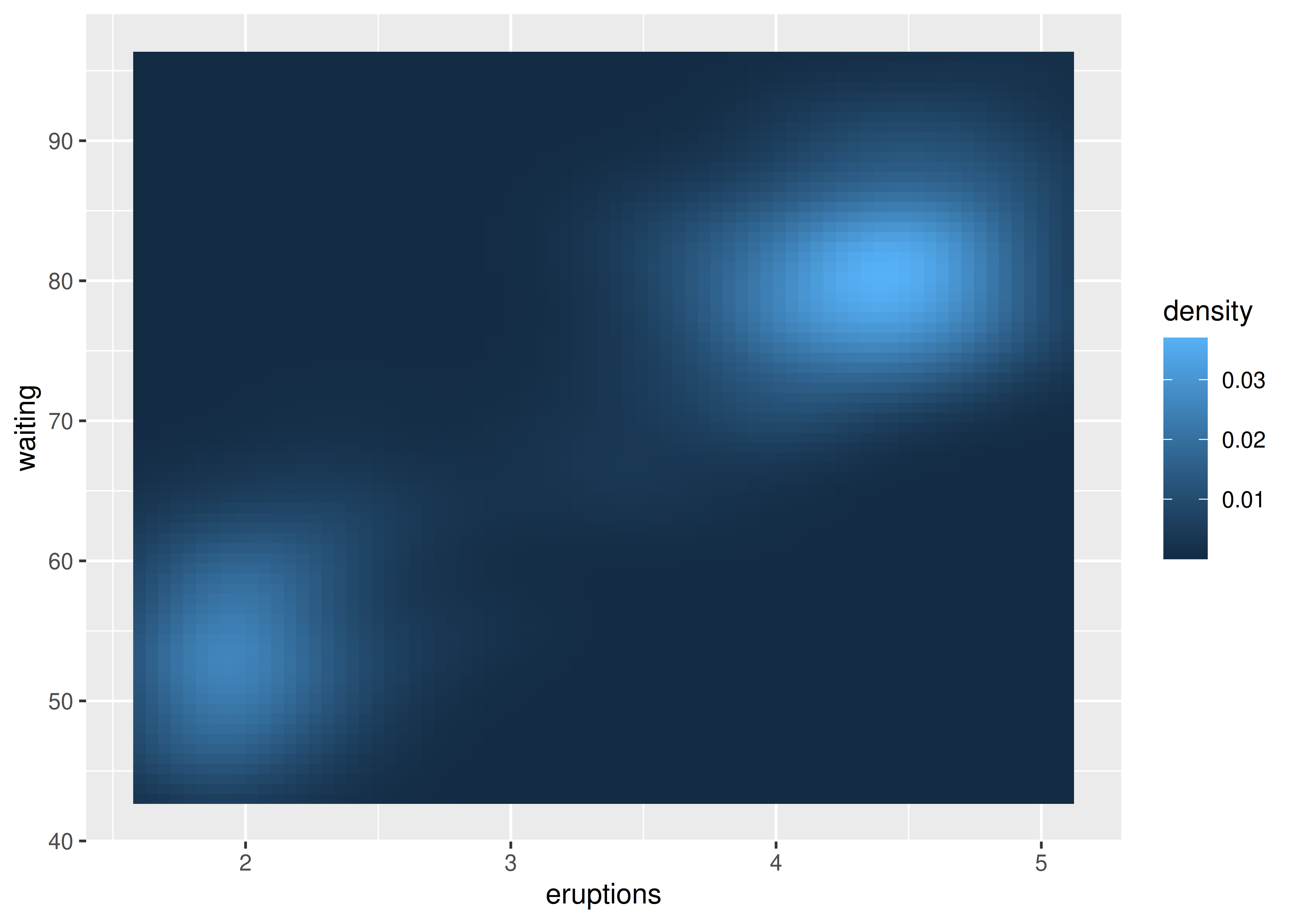 La referencia a la variable ..level... en este código puede parecer confusa, porque no hay ninguna variable llamada ...level... en los datos de faithfuld. En este contexto, la notación .. se refiere a una variable calculada internamente (consulte Sección 13.6.1). Para mostrar la misma densidad que un mapa de calor, puede utilizar geom_raster():