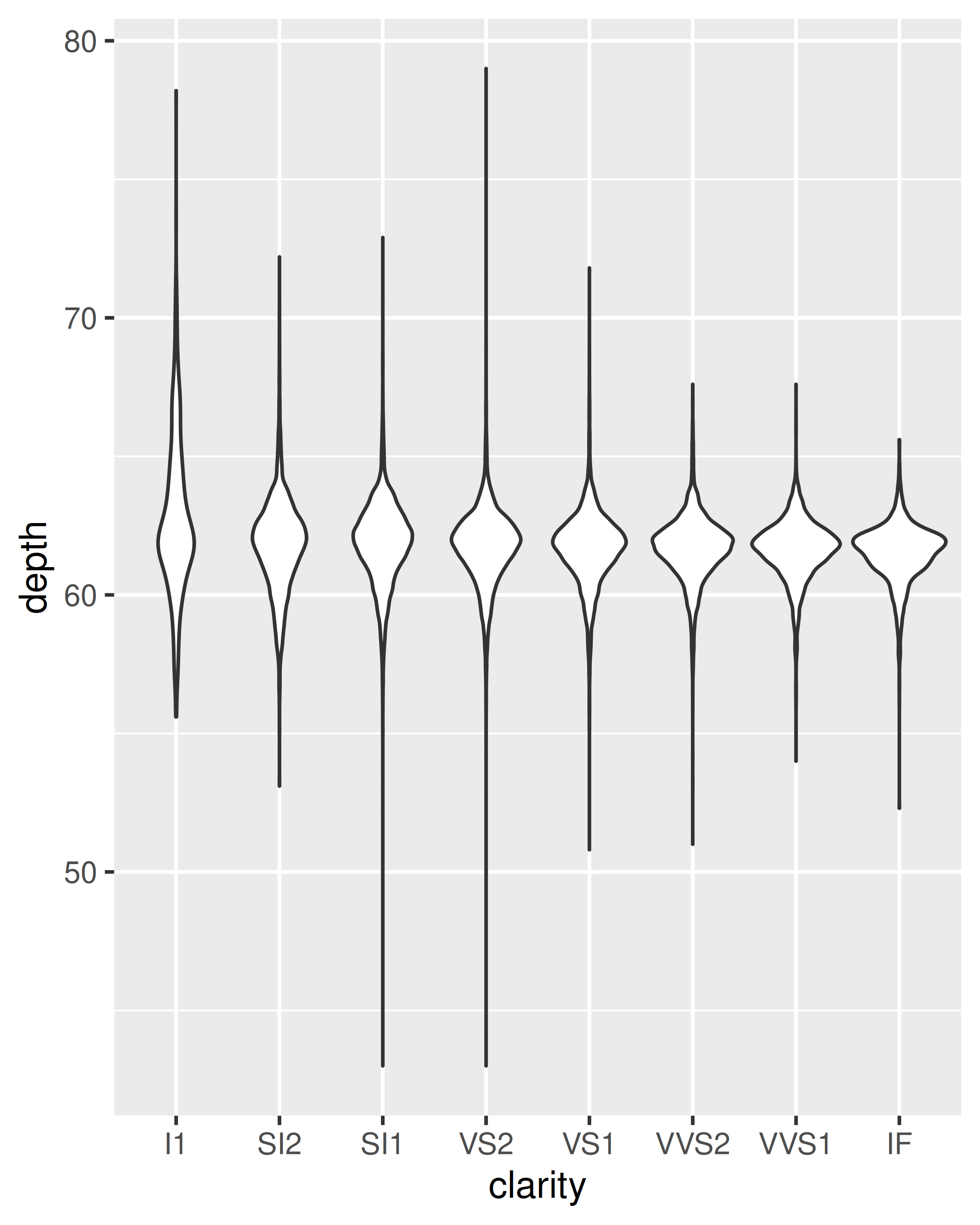 geom_violin(): el diagrama del violín es una versión compacta del diagrama de densidad. El cálculo subyacente es el mismo, pero los resultados se muestran de forma similar al diagrama de caja:ggplot(diamonds, aes(clarity, depth)) + geom_violin() ggplot(diamonds, aes(carat, depth)) + geom_violin(aes(group = cut_width(carat, 0.1))) + xlim(NA, 2.05) #> Warning: Removed 997 rows containing non-finite outside the scale range #> (`stat_ydensity()`).