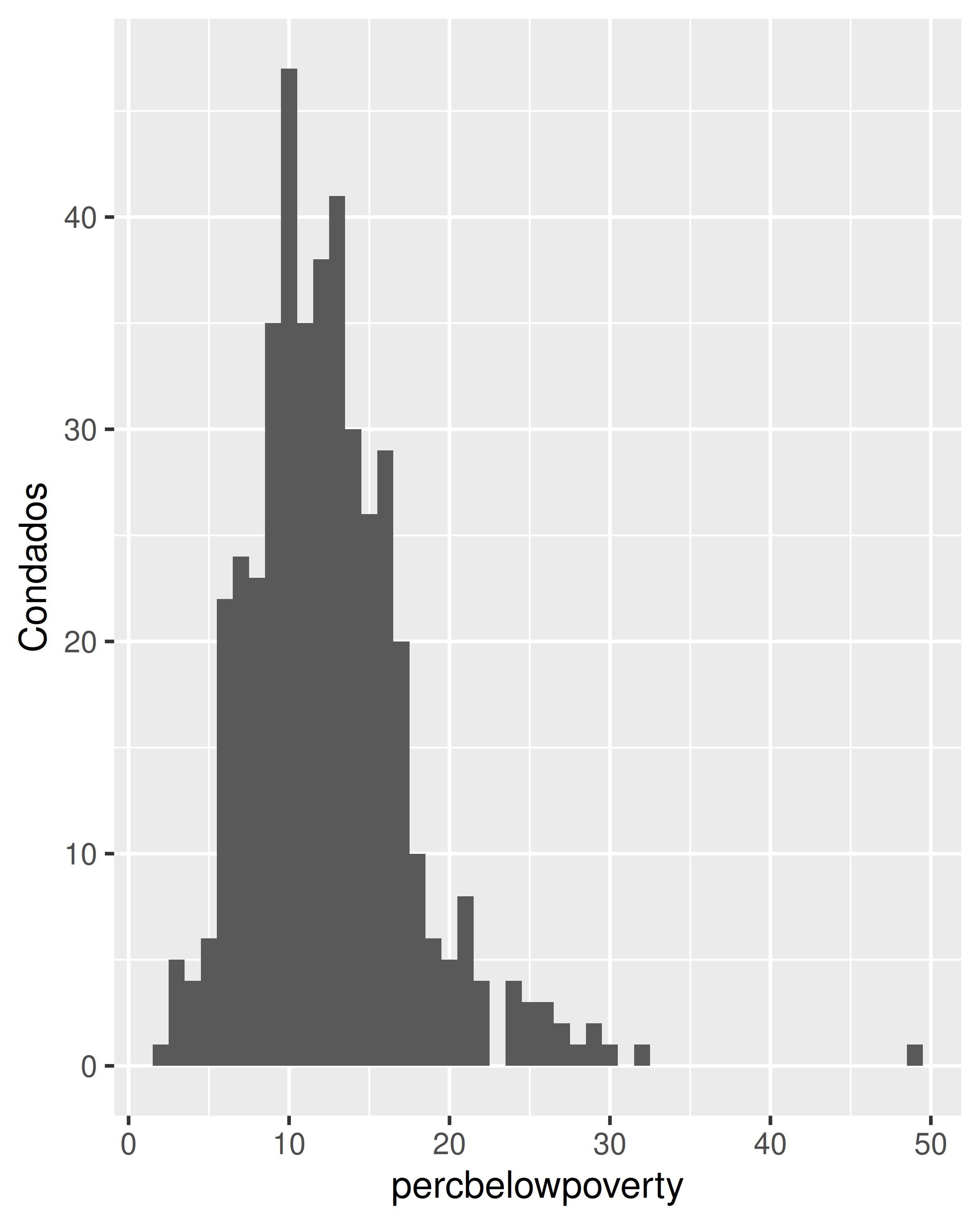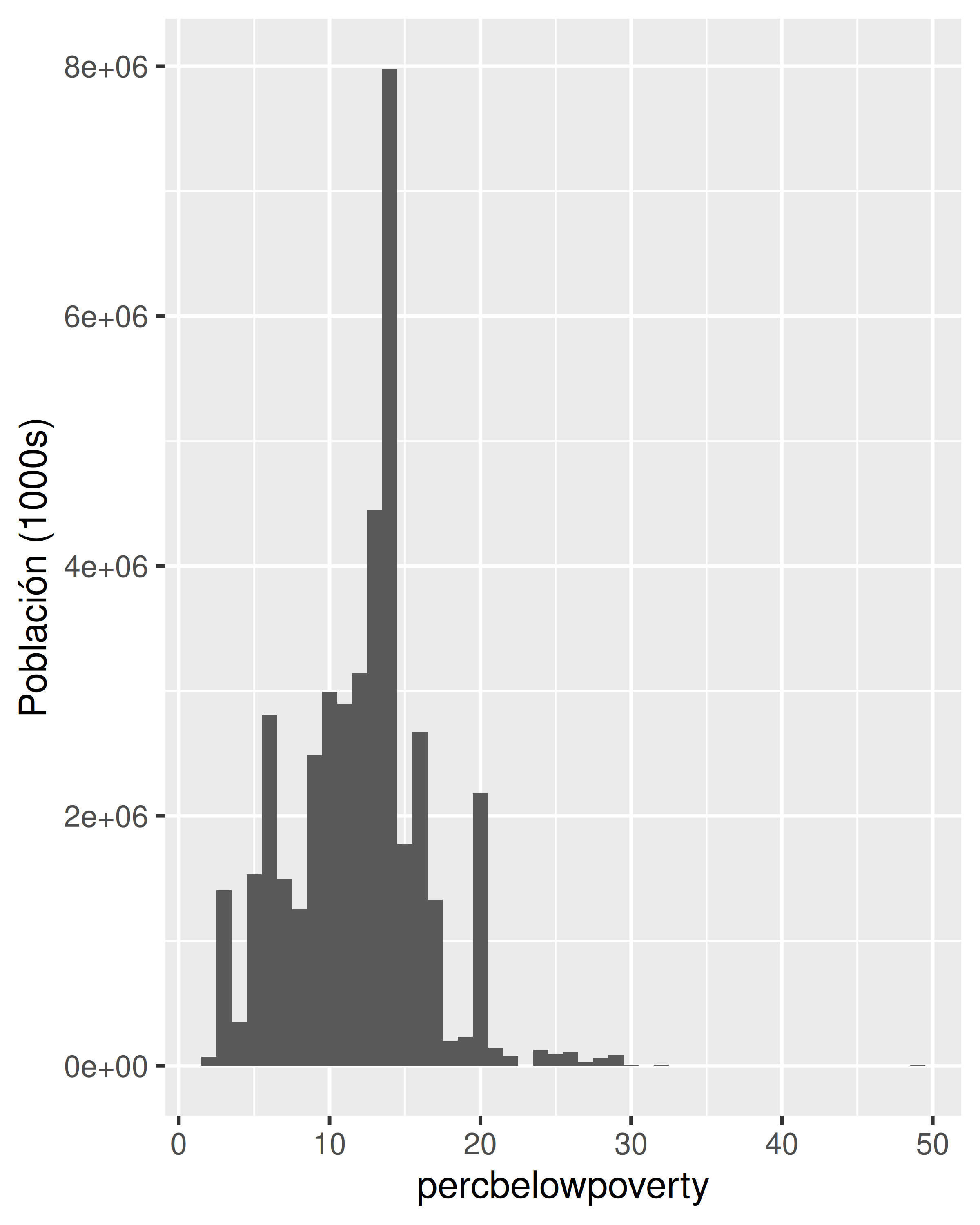 Cuando ponderamos un histograma o un gráfico de densidad por la población total, pasamos de observar la distribución del número de condados a la distribución del número de personas. El siguiente código muestra la diferencia que esto supone para un histograma del porcentaje por debajo del umbral de pobreza: