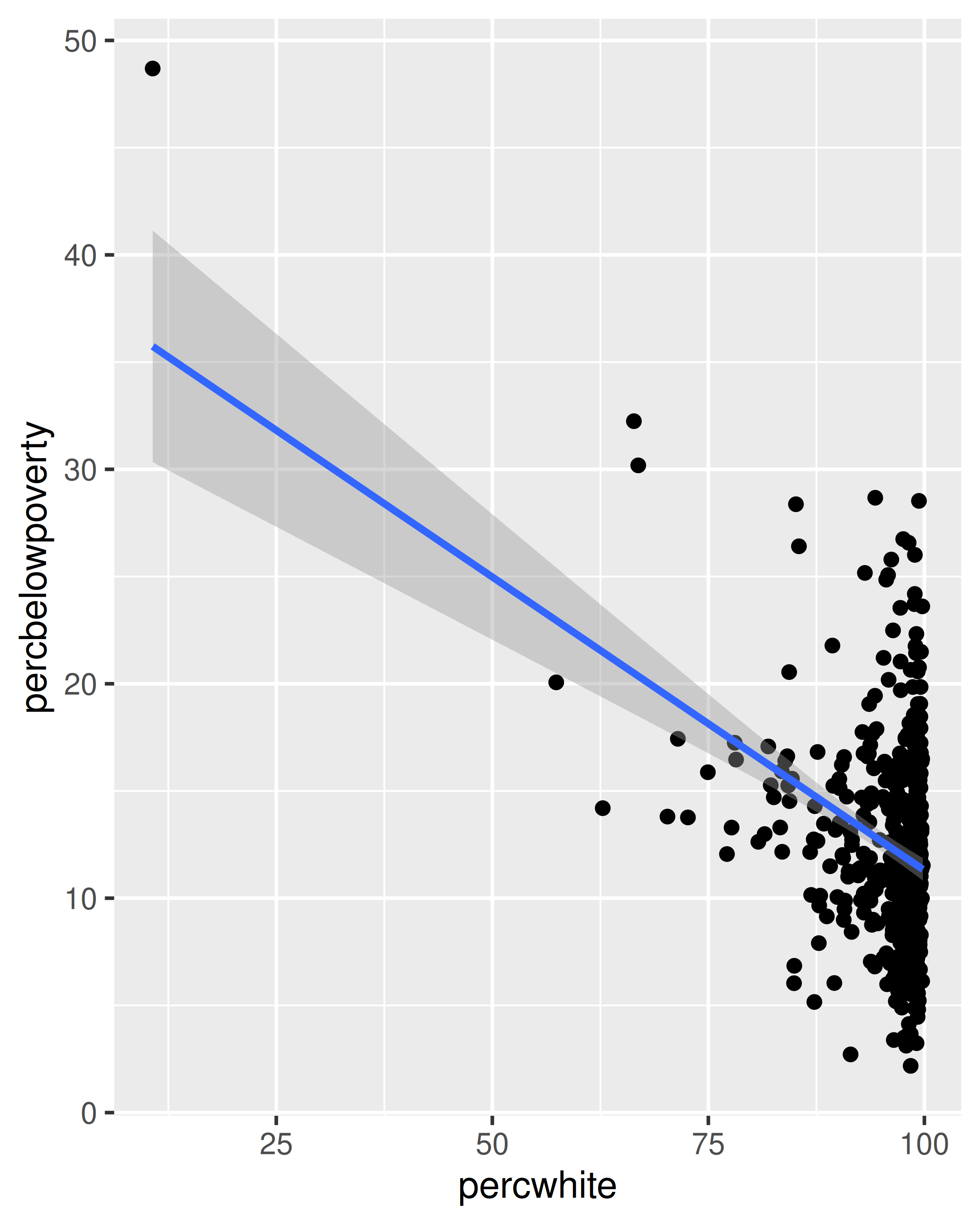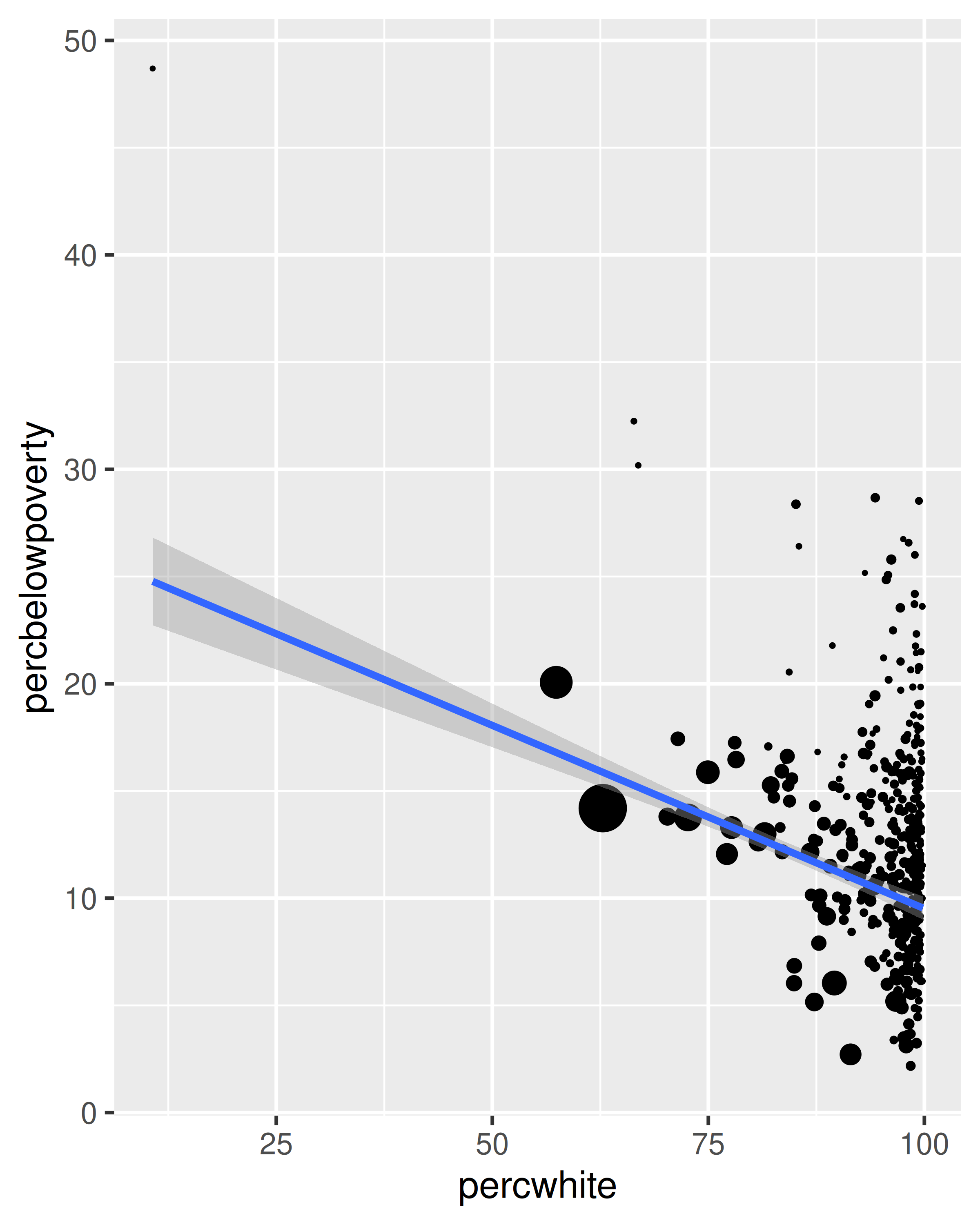Para geomas más complicadas que implican alguna transformación estadística, especificamos pesos con la estética weight. Estos pesos se pasarán a la función de resumen estadístico. Se admiten ponderaciones para todos los casos en los que tenga sentido: suavizadores, regresiones cuantiles, diagramas de caja, histogramas y diagramas de densidad. No puede ver esta variable de ponderación directamente y no produce una leyenda, pero cambiará los resultados del resumen estadístico. El siguiente código muestra cómo la ponderación por densidad de población afecta la relación entre el porcentaje de blancos y el porcentaje por debajo del umbral de pobreza.