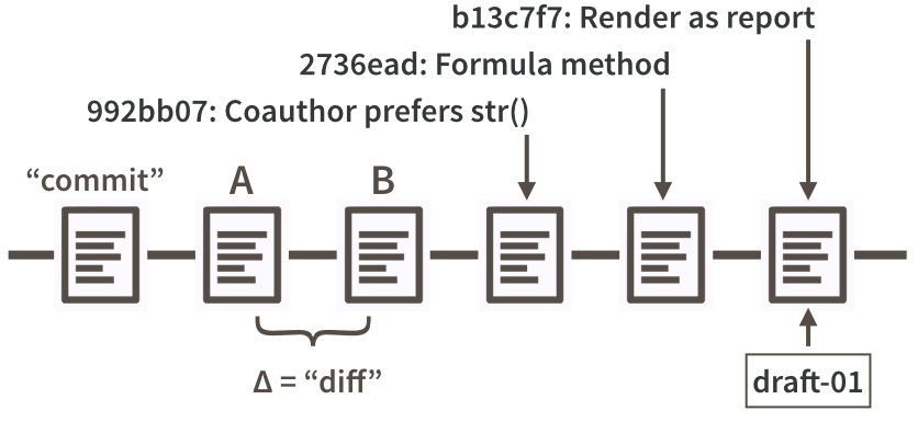 Cada confirmación necesita algún tipo de apodo para que puedas identificarla. Git hace esto automáticamente, asignando a cada confirmación lo que se llama un SHA, una cadena aparentemente aleatoria de 40 letras y números (de hecho, no es aleatoria, sino que es un hash de suma de verificación SHA-1 de la confirmación). Aunque estará expuesto a estos, no es necesario que los maneje directamente con mucha frecuencia y, cuando lo hace, normalmente los primeros 7 caracteres son suficientes. Los mensajes de confirmación en Figura 20.1 tienen el prefijo SHA truncado. También puedes designar ciertas instantáneas como especiales con una etiqueta, que es el nombre que elijas. En un proyecto de software, es típico etiquetar una versión con su versión, por ejemplo, “v1.0.3”. Para un manuscrito o proyecto analítico, puede etiquetar la versión enviada a una revista o transmitida a colaboradores externos. Figura 20.1 muestra una etiqueta, “draft-01”, asociada con la última confirmación.