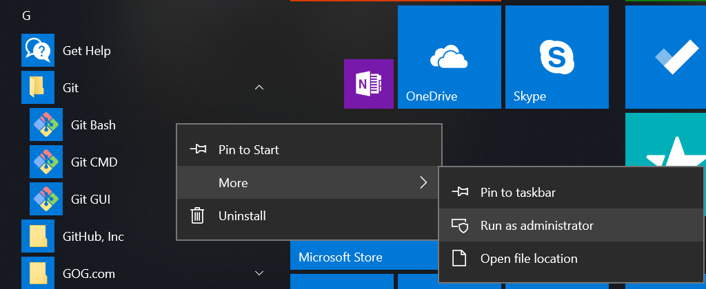 A veces es necesario ejecutar Git Bash como administrador, p. para ejecutar con mayores privilegios. La forma más fácil: haga clic en el menú “Git” en el menú de Windows y haga clic derecho en “Git Bash”. Esto revela un submenú. Seleccione “más” y luego “Ejecutar como administrador”.