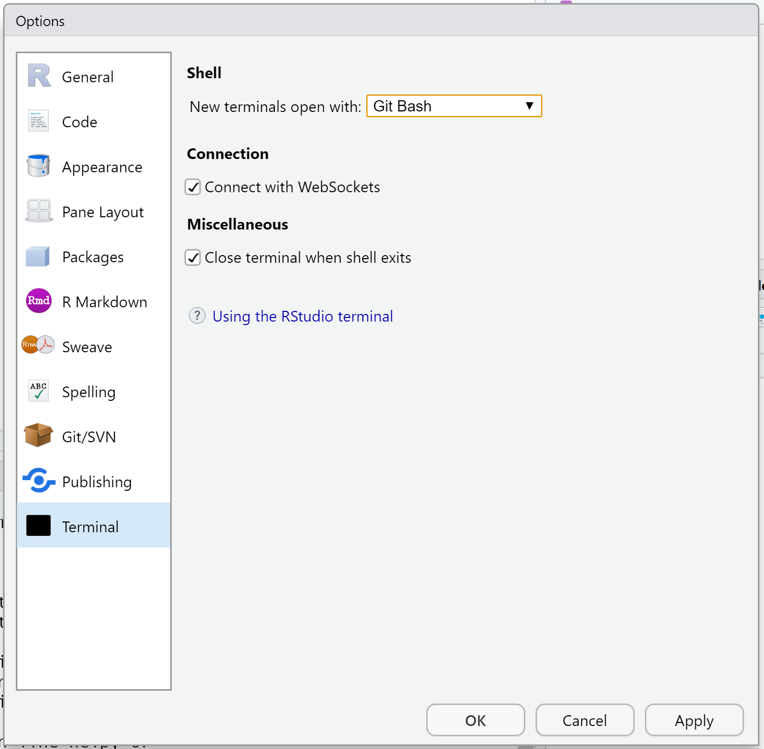 RStudio debería detectar automáticamente la presencia de Git Bash. Puede inspeccionar e influir en esto directamente a través de Tools > Global Options > Terminal. A menos que tenga una buena razón para hacer lo contrario, querrá ver “Git Bash” en el menú desplegable “Nuevas terminales abiertas con…”.