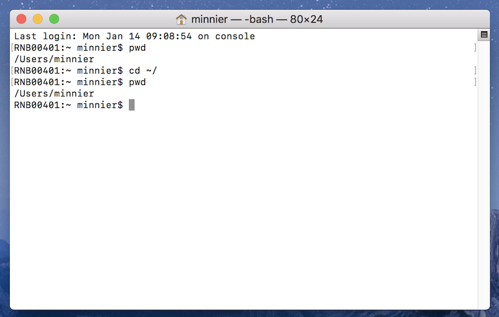 Al abrir Terminal.app, accederá a un shell bash abierto en su directorio de inicio ~/, que es una abreviatura de /Users/SUNOMBREDEUSUARIO. Deberías ver algo como esto: