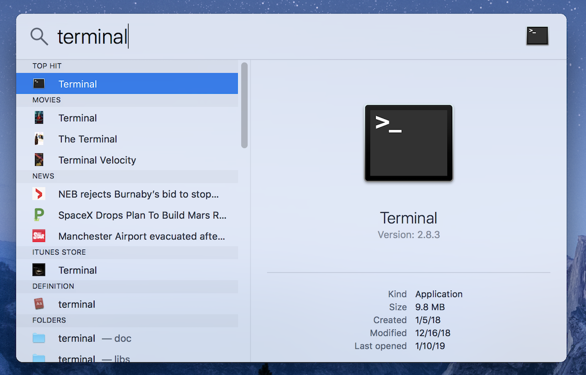 El shell a menudo se denomina “terminal” en macOS, con lo que la gente se refiere a Terminal.app. Una forma de iniciarlo es a través de Spotlight Search. Escribe Comando + espacio y comienza a escribir “terminal”. Este proceso será algo así: