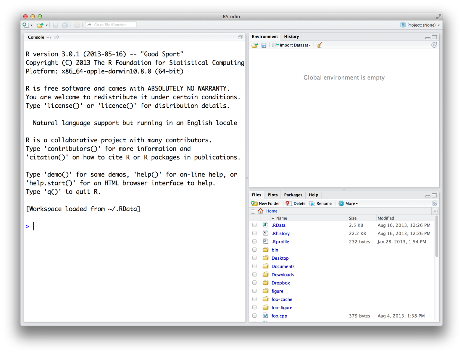 R no es un programa que pueda abrir y comenzar a usar, como Microsoft Word o Internet Explorer. En cambio, R es un lenguaje de programación, como C, C++ o UNIX. Usas R escribiendo comandos en el lenguaje R y pidiéndole a tu computadora que los interprete. En los viejos tiempos, la gente ejecutaba código R en una ventana de terminal UNIX, como si fueran piratas informáticos en una película de los años ochenta. Ahora casi todo el mundo usa R con una aplicación llamada RStudio, y te recomiendo que tú también lo hagas.