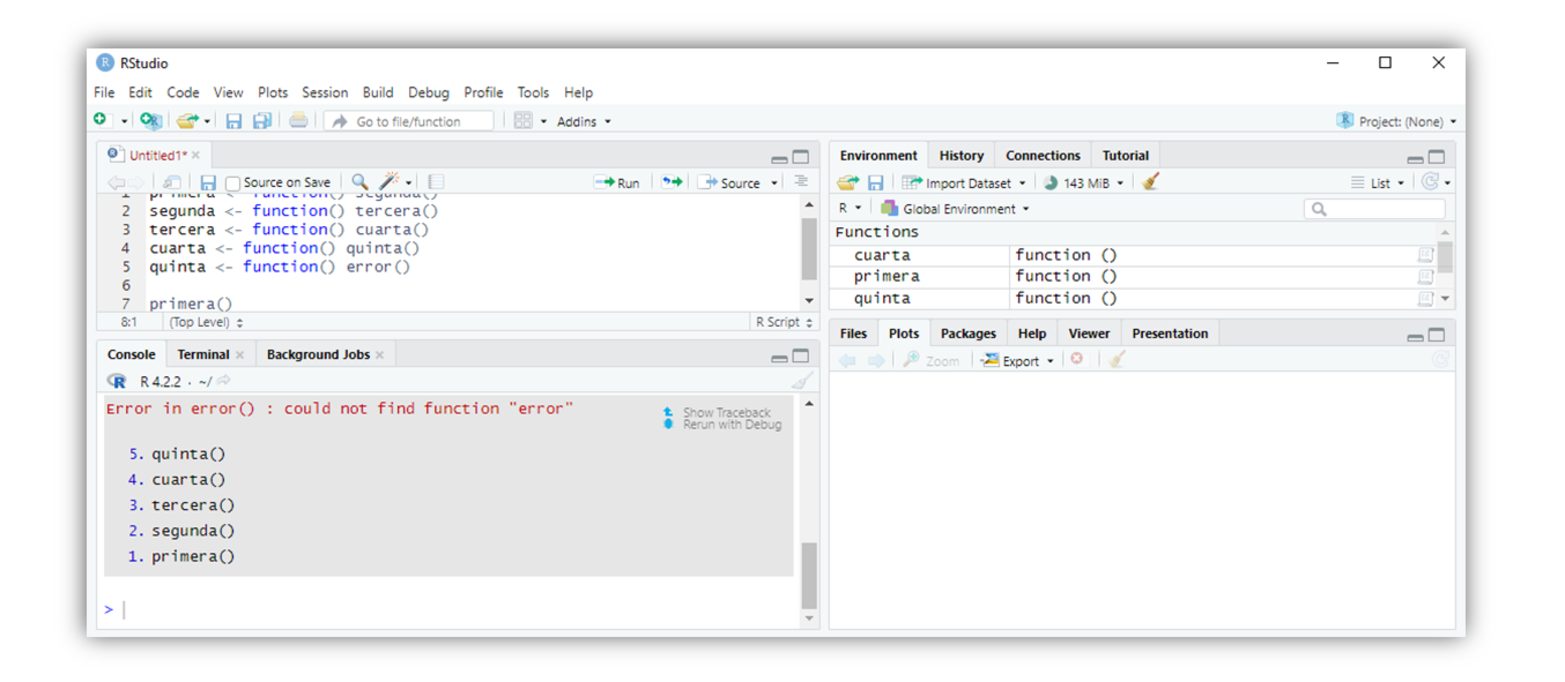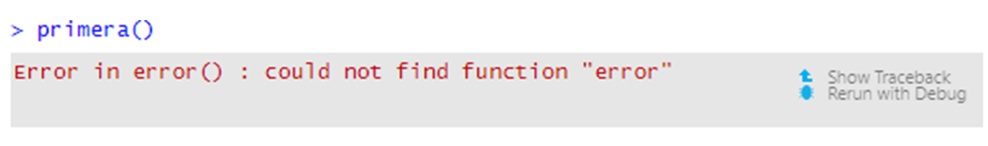 ## Error in quinta() : could not find function "error" El informe de error nos dice que el error ocurrió cuando R intentó ejecutar quinta. También nos dice la naturaleza del error (no existe una función llamada error). Aquí, es obvio por qué R llama a quinta, pero podría no ser tan obvio por qué R llama a una función cuando ocurre un error en la naturaleza.