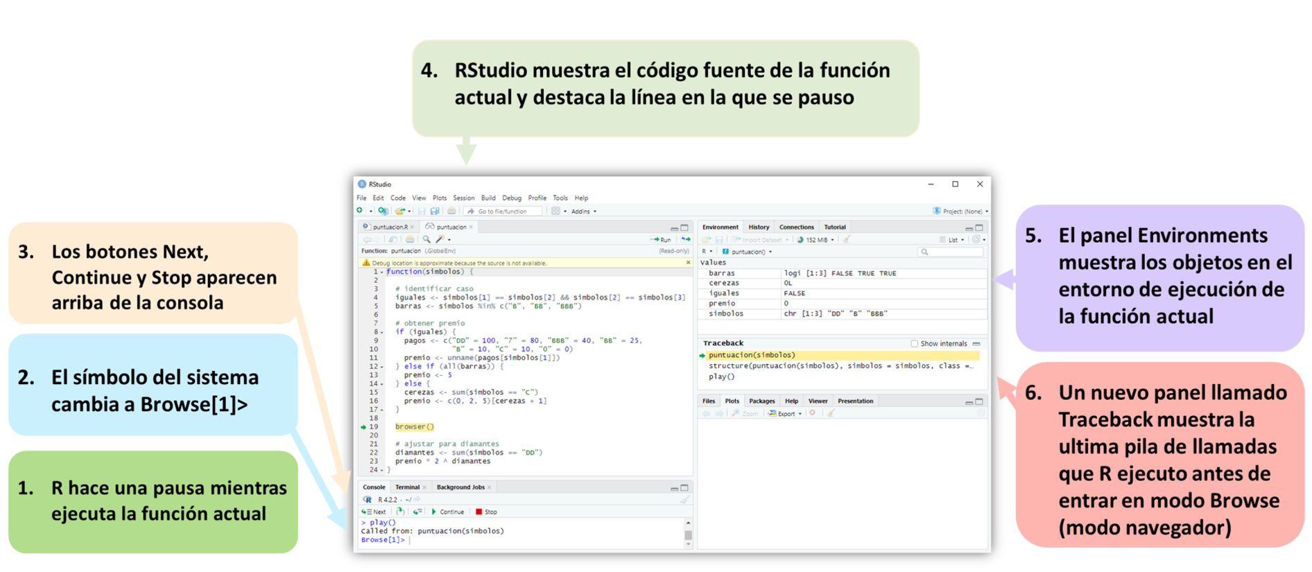 Cuando ejecutas play, play llamará a obt_simbolos y luego a puntuacion. A medida que R trabaja a través de puntuacion, encontrará la llamada a browser y la ejecutará. Cuando R ejecuta esta llamada, sucederán varias cosas, como en la Figura Figura E.3. Primero, R dejará de ejecutar puntuacion. En segundo lugar, el símbolo del sistema cambiará a browser[1]> y R me devolverá el control; Ahora puedo escribir nuevos comandos en el nuevo símbolo del sistema. En tercer lugar, aparecerán tres botones sobre el panel de la consola: Next, Continue y Stop. En cuarto lugar, RStudio mostrará el código fuente de puntuacion en el panel de secuencias de comandos y resaltará la línea que contiene browser(). Quinto, la pestaña de entornos cambiará. En lugar de revelar los objetos que se guardan en el entorno global, revelará los objetos que se guardan en el entorno de tiempo de ejecución de puntuacion (consulte Entornos para obtener una explicación del sistema de entorno de R). En sexto lugar, RStudio abrirá un nuevo panel de seguimiento, que muestra la pila de llamadas que tomó RStudio para llegar al browser. Se resaltará la función más reciente, puntuacion.