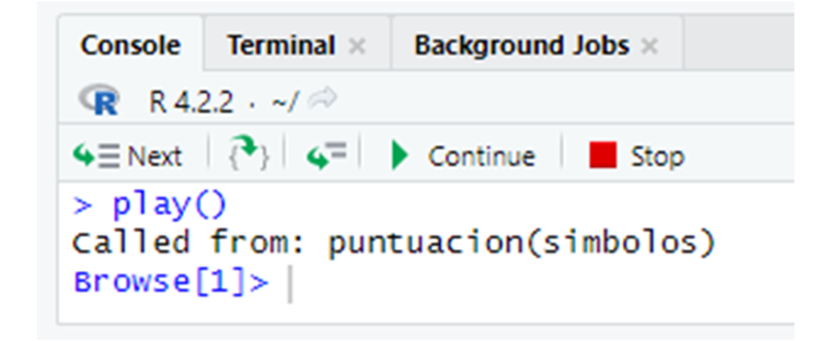 }Ahora, siempre que R ejecute puntuacion, llegará a la llamada browser(). Puede ver esto con la función play de Programas y S3. Si no tiene play a mano, puede acceder ejecutando este código: