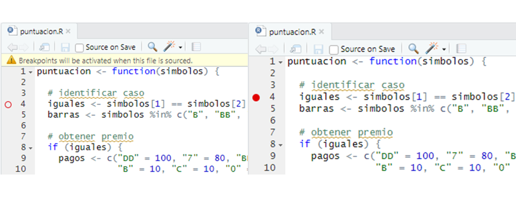 Para usar browser, agregue la llamada browser() al cuerpo de una función y luego vuelva a guardar la función. Por ejemplo, si quisiera hacer una pausa en medio de la función puntuacion de Programas, podría agregar browser() al cuerpo de puntuacion y luego volver a ejecutar el siguiente código, que define puntuacion: