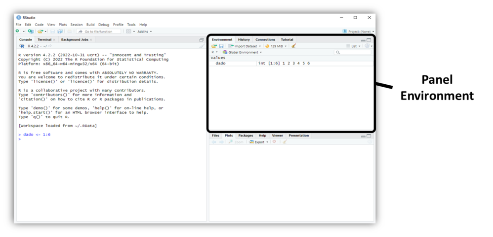 ## 1 2 3 4 5 6Cuando crea un objeto, el objeto aparecerá en el panel de Environment de RStudio, como se muestra en la Figura Figura 1.2. Este panel le mostrará todos los objetos que ha creado desde que abrió RStudio.