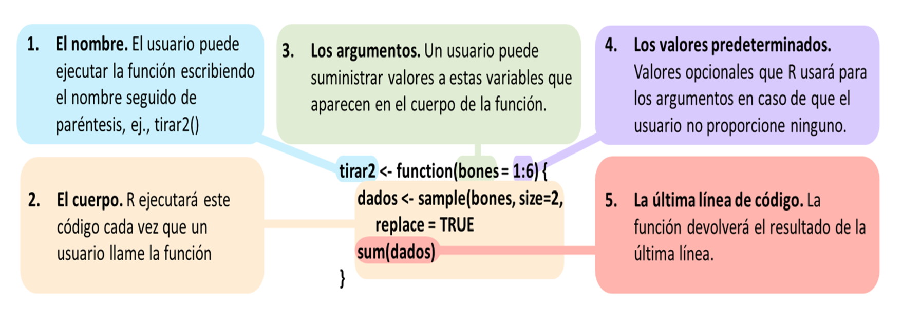 Para resumir, function te ayuda a construir tus propias funciones de R. Usted crea un cuerpo de código para que su función se ejecute escribiendo código entre las llaves que siguen a function. Usted crea argumentos para que su función los use proporcionando sus nombres entre los paréntesis que siguen a function. Finalmente, le da un nombre a su función guardando su salida en un objeto de R, como se muestra en la Figura Figura 1.6.