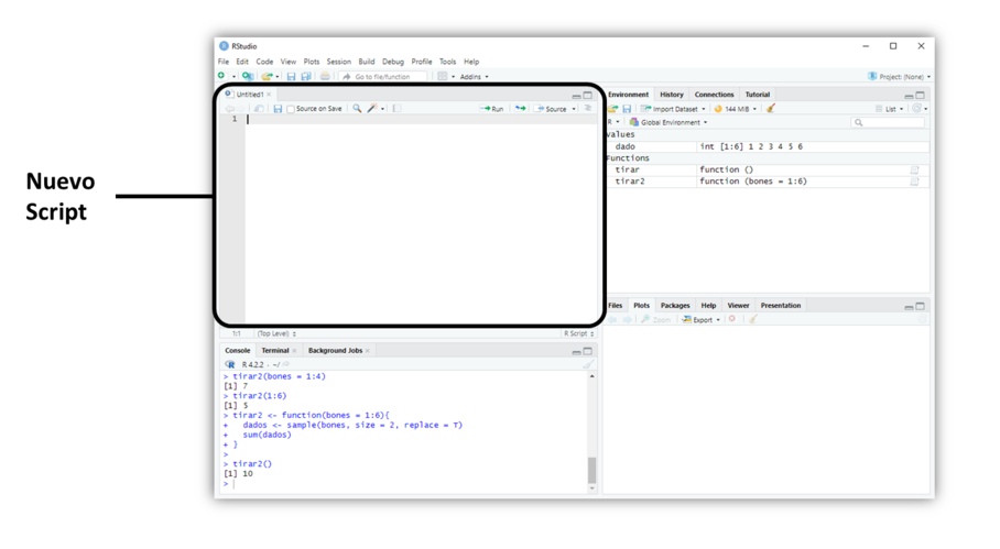 ¿Qué pasa si quieres editar tirar2 de nuevo? Podría regresar y volver a escribir cada línea de código en tirar2, pero sería mucho más fácil si tuviera un borrador del código para empezar. Puede crear un borrador de su código a medida que avanza utilizando un script de R. Un script de R es solo un archivo de texto sin formato en el que guarda el código R. Puede abrir un script de R en RStudio yendo a File> New File> R script en la barra de menú. RStudio luego abrirá un script nuevo sobre el panel de su consola, como se muestra en la Figura Figura 1.7.