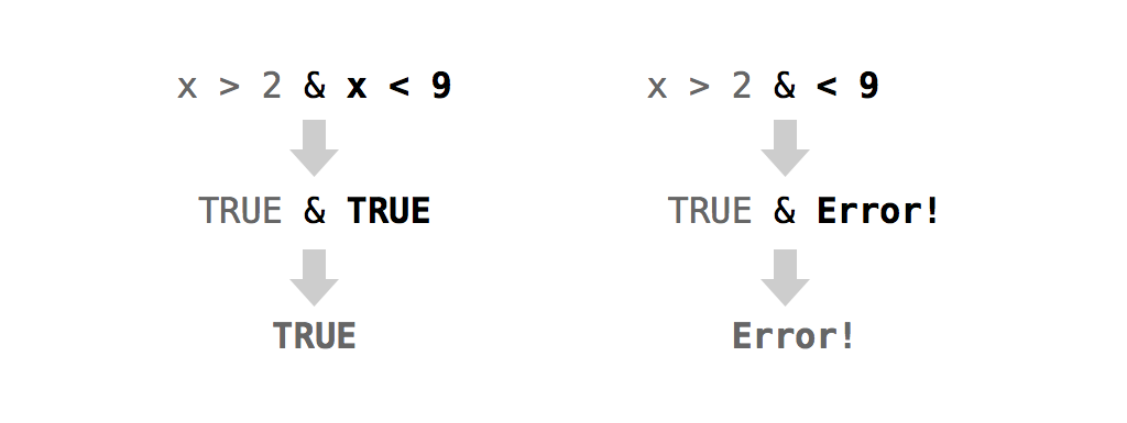 Es fácil olvidar poner una prueba completa a cada lado de un operador booleano. En español, es eficiente decir “¿Es x mayor que dos y menor que nueve?” Pero en R, necesitas escribir el equivalente de “¿Es x mayor que dos y es x menor que nueve?” Esto se muestra en la Figura Figura 5.1.