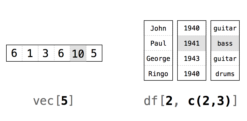 De hecho, puede usar el sistema de notación de R para acceder a valores en cualquier objeto R. Para usarlo, escriba el nombre de un objeto seguido de corchetes e índices. Si su objeto es unidimensional, como un vector, solo necesita proporcionar un índice. Si es bidimensional, como un data frame, debe proporcionar dos índices separados por una coma. Y, si es n-dimensional, debe proporcionar n índices, cada uno separado por una coma.