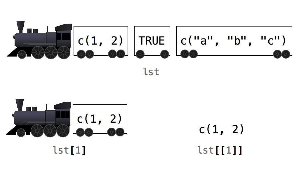 ## 1 2Esta diferencia es sutil pero importante. En la comunidad de R, hay una forma popular y útil de pensar en ello, Figure Figura 4.3. Imagina que cada lista es un tren y cada elemento es un vagón de tren. Cuando usa corchetes individuales, R selecciona vagones de tren individuales y los devuelve como un tren nuevo. Cada vagón mantiene su contenido, pero ese contenido todavía está dentro de un vagón de tren (es decir, una lista). Cuando usa corchetes dobles, R en realidad descarga el automóvil y le devuelve el contenido.