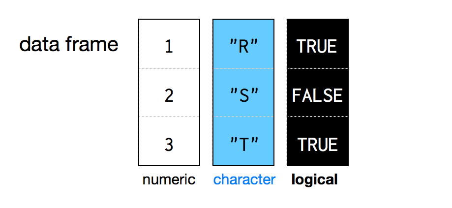 Data frames agrupan vectores en una tabla bidimensional. Cada vector se convierte en una columna en la tabla. Como resultado, cada columna de un data frame puede contener un tipo diferente de datos; pero dentro de una columna, cada celda debe tener el mismo tipo de datos, como en la Figura Figura 3.2.