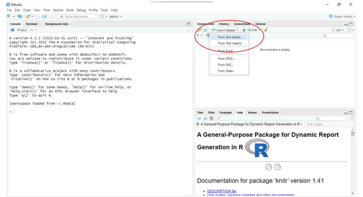 Para cargar un archivo de texto sin formato en R, haga clic en el icono Import Dataset en RStudio, que se muestra en la Figura Figura 3.3. Luego seleccione “From text file (base)”.