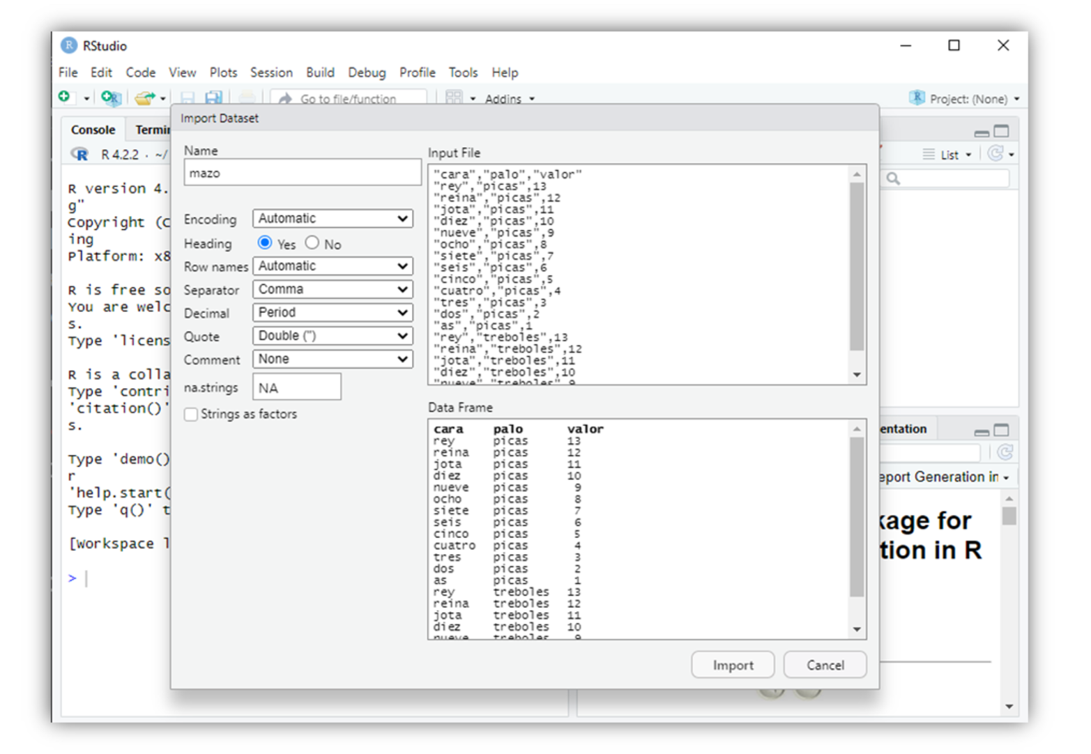 Ahora es tu turno. Descargue mazo.csv e impórtelo a RStudio. Asegúrese de guardar la salida en un objeto de R llamado mazo: lo usará en los próximos capítulos. Si todo va correctamente, las primeras líneas de su data frame deberían verse así: