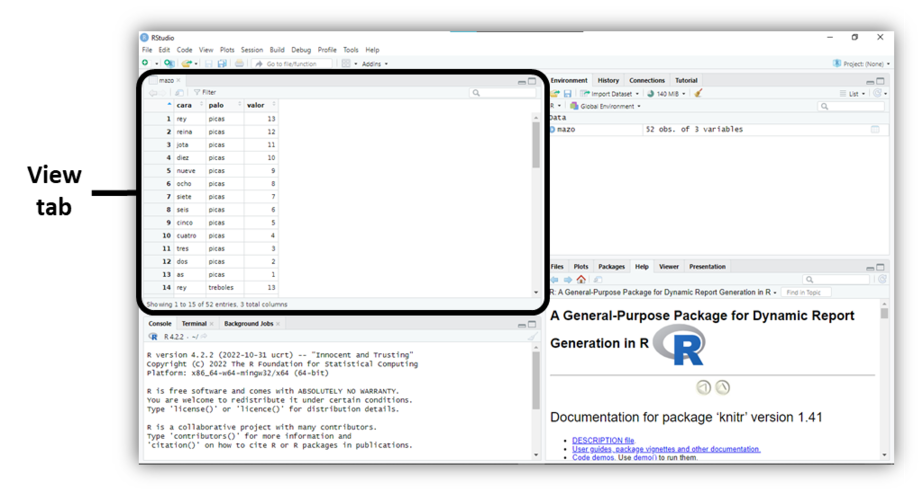 Una vez que todo se vea bien, haga clic en Import. RStudio leerá los datos y los guardará en un data frame. RStudio también abrirá un visor de datos, para que pueda ver sus nuevos datos en un formato de hoja de cálculo. Esta es una buena manera de verificar que todo salió como se esperaba. Si todo funcionó bien, su archivo debería aparecer en una pestaña View de RStudio, como se ve en la Figura Figura 3.5. Puede examinar el data frame en la consola con head(mazo)