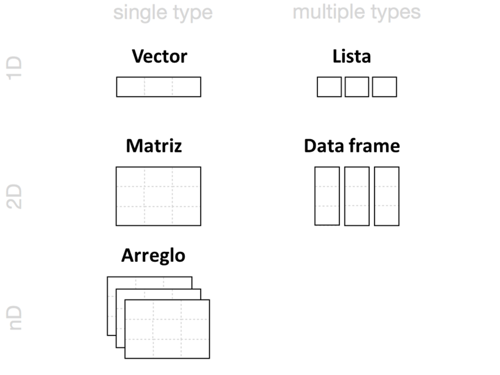Puede guardar datos en R con cinco objetos diferentes, que le permiten almacenar diferentes tipos de valores en diferentes tipos de relaciones, como en la Figura Figura 3.6. De estos objetos, los data frame son, por mucho, los más útiles para la ciencia de datos. Los data frame almacenan una de las formas de datos más comunes utilizadas en la ciencia de datos, los datos tabulares.