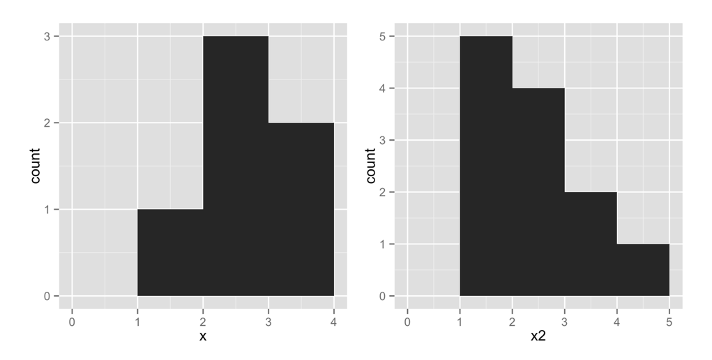 Probemos con otro histograma. Este código crea el gráfico de la derecha en la Figura Figura 2.2. Observe que hay cinco puntos con un valor de 1 en x2. El histograma muestra esto trazando una barra de altura 5 sobre el intervalo x2 = [1, 2):