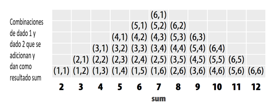 Bueno, si tiras los dados muchas veces y haces un seguimiento de los resultados, esperarás que algunos números ocurran más que otros. Esto se debe a que hay más formas de obtener algunos números sumando dos dados que de obtener otros números, como se muestra en la Figura Figura 2.3.