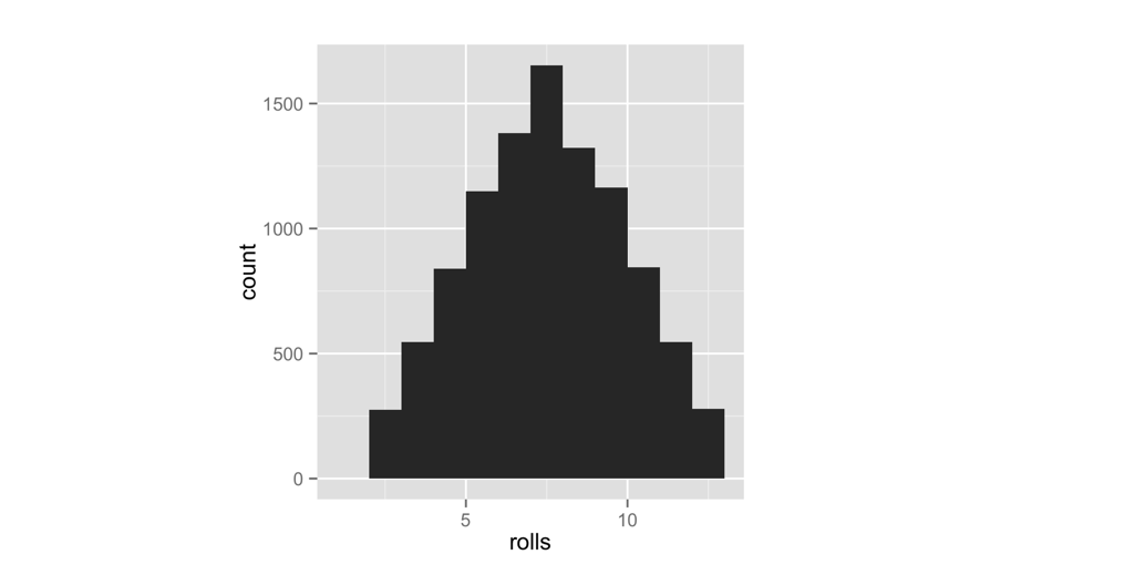 Si tira los dados muchas veces y grafica los resultados con qplot, el histograma le mostrará con qué frecuencia apareció cada suma. Las sumas que ocurrieron con mayor frecuencia tendrán las barras más altas. El histograma debería parecerse al patrón de la Figura Figura 2.3 si los dados tienen un peso justo.