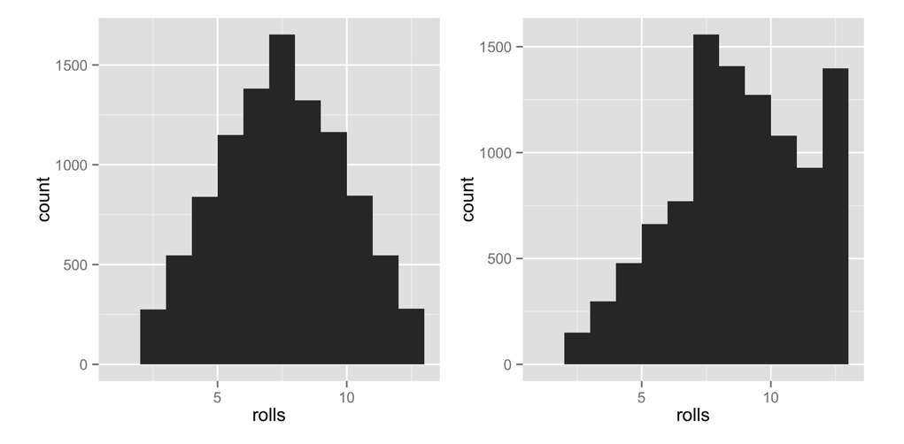 Sobrescriba su versión anterior de tirar con la nueva función (ejecutando el fragmento de código anterior en su línea de comando). Luego visualiza el nuevo comportamiento a largo plazo de tus dados. He puesto los resultados en la Figura Figura 2.5 junto a nuestros resultados originales:
